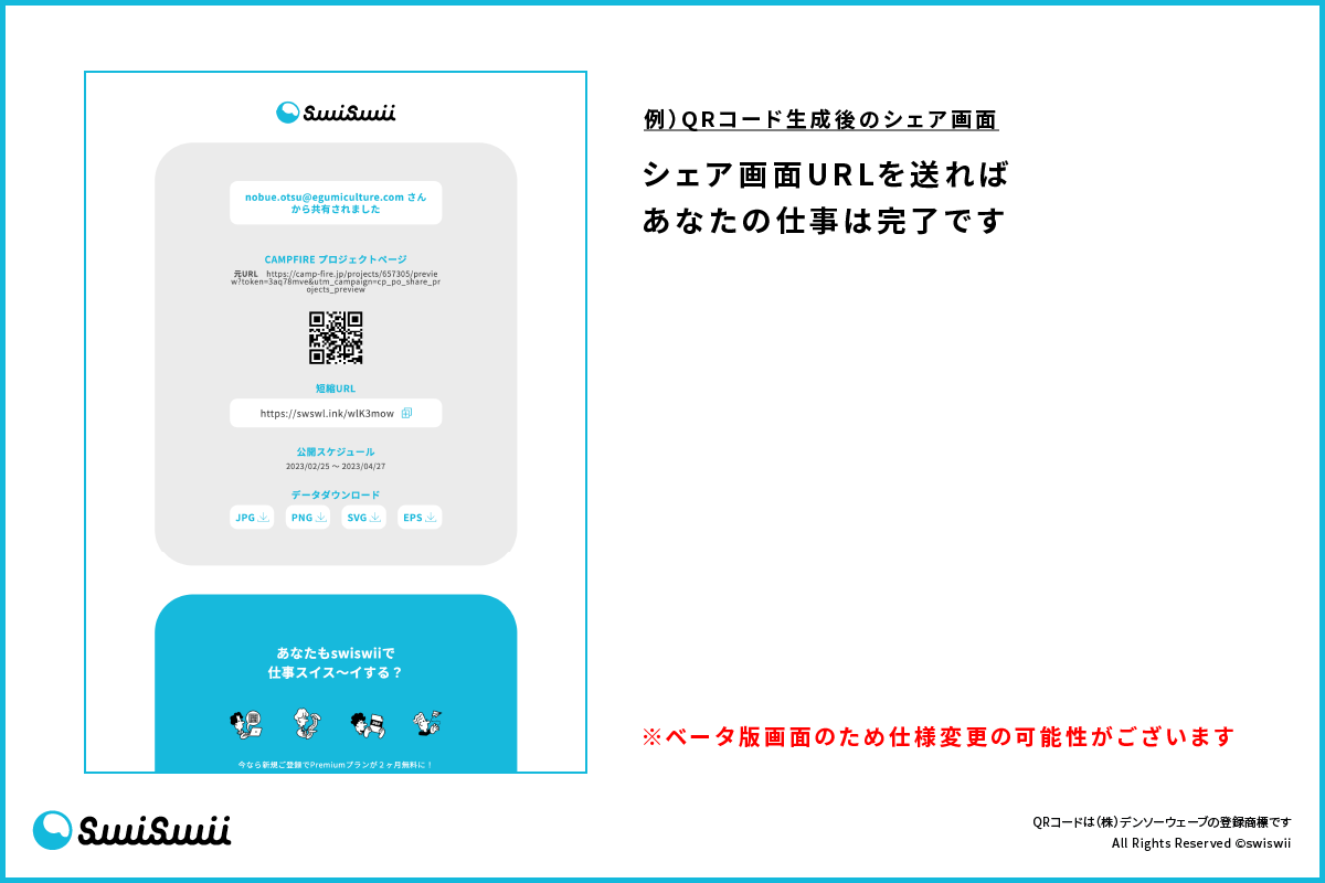 QRコードを生成後に発行されるシェアURLを送れば、QRコードをダウンロードして、メールで送る手間を省くことができます。すべての機能でこのシェアURLが自動で発行されます。