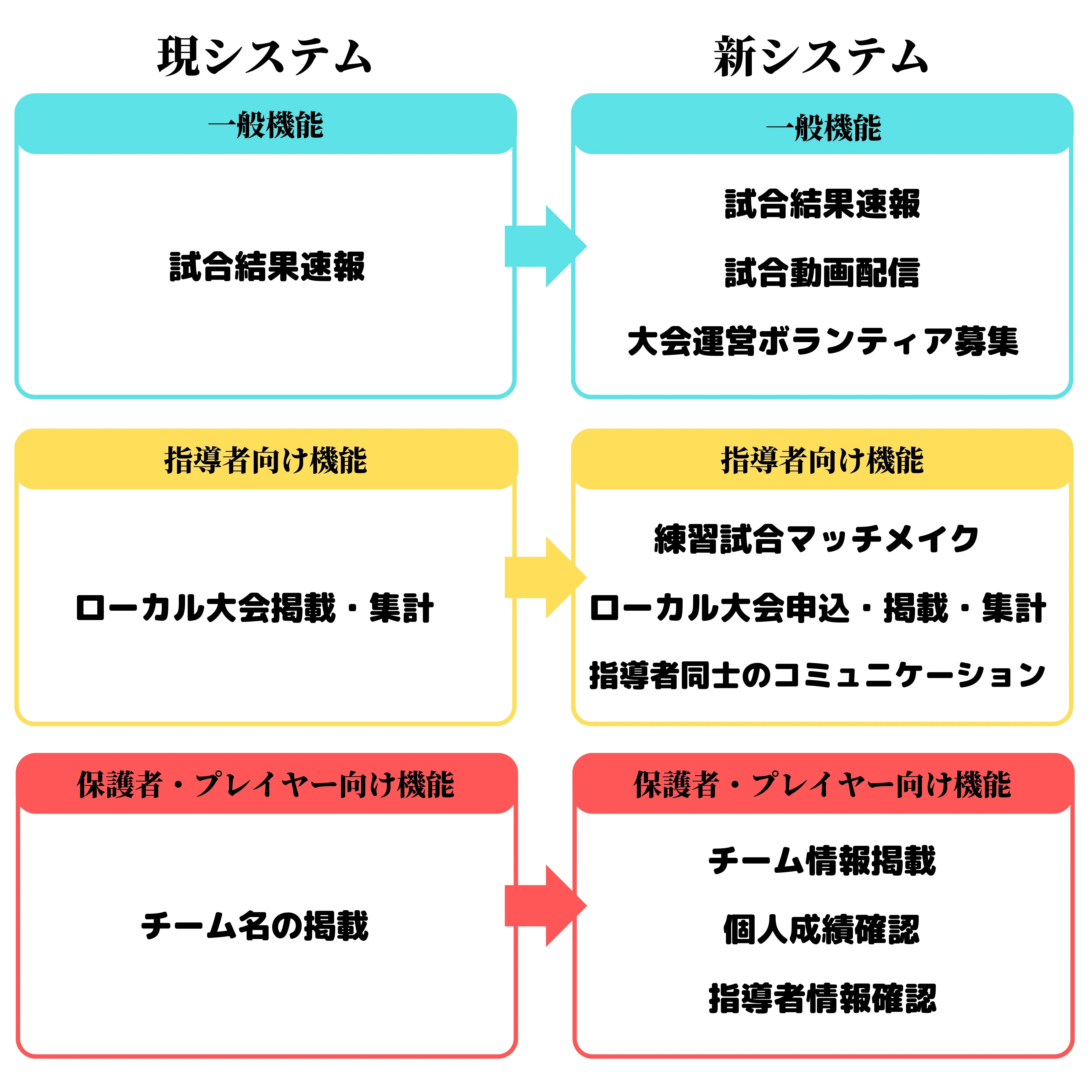 試合動画配信機能・大会運営ボランティア募集・練習試合マッチメイク機能・ローカル大会申込機能・指導者同士のコミュニケーション機能・チーム情報確認機能・個人成績確認機能・指導者情報確認機能