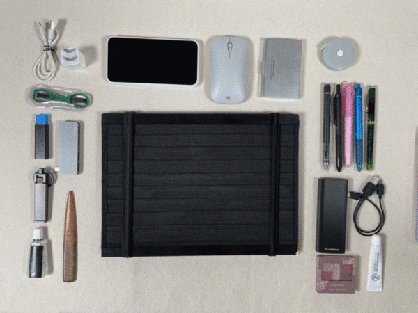 入れた小物はズレて重なり、場所も厚さも最小限です。