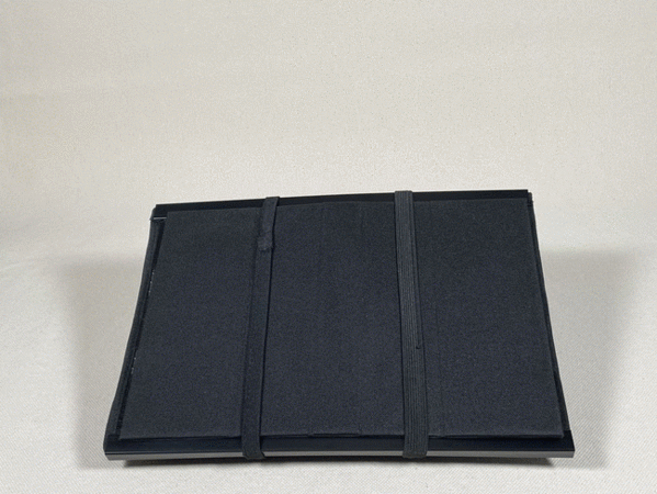 ボードに収縮バンド9枚をずらして重ね、その隙間からモノを入れて収納する構造です。