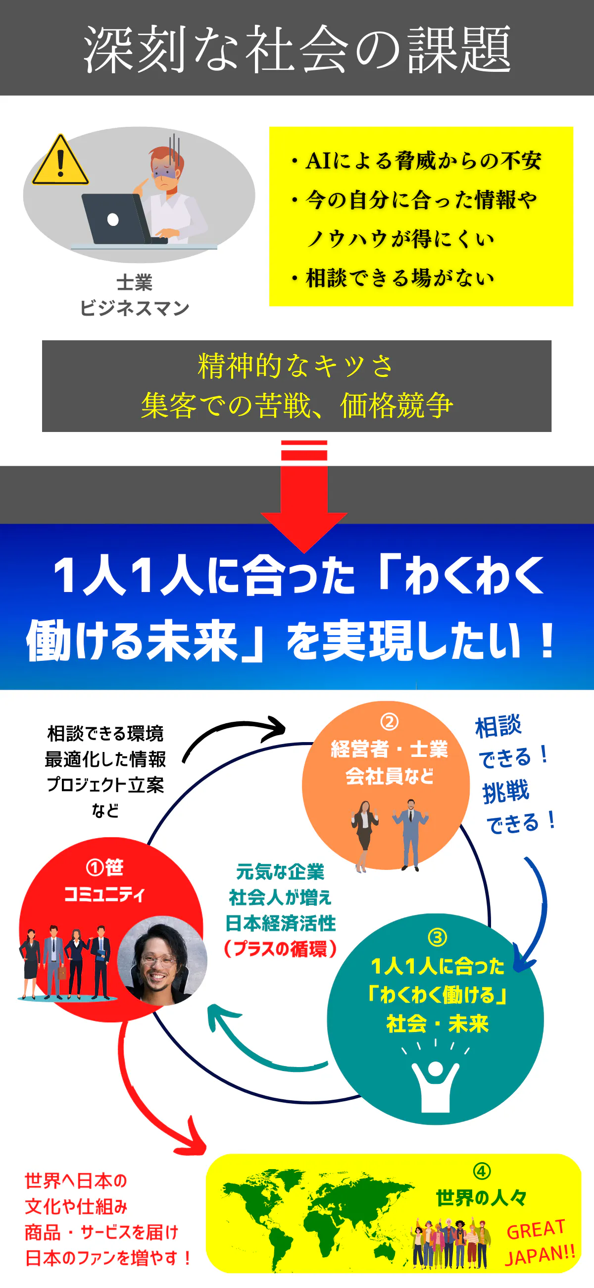 そこで、こういった働き方や相談しあえる環境があることをお伝えしたい。もっとコミュニティを充実させ、みんなでこのAI時代の社会課題を打破していきたい!