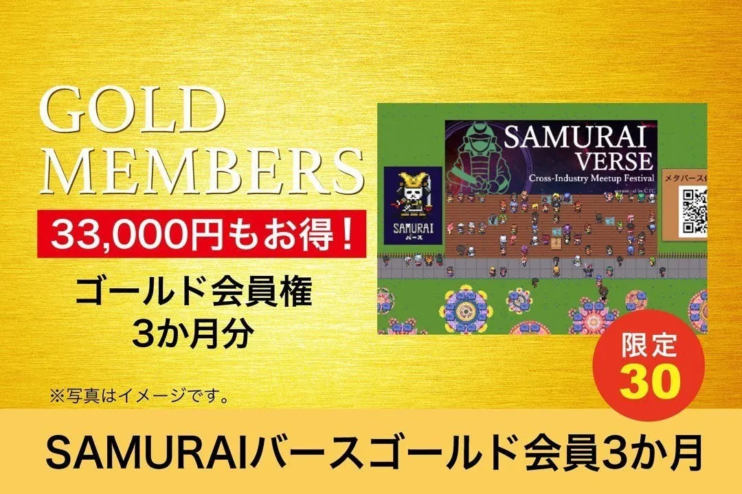 「SAMURAIバース」のゴールド会員権3か月分です。 通常価格66,000円(入会金33,000円+月会費11,000×3か月)のところ、入会金相当の33,000円お得です!
