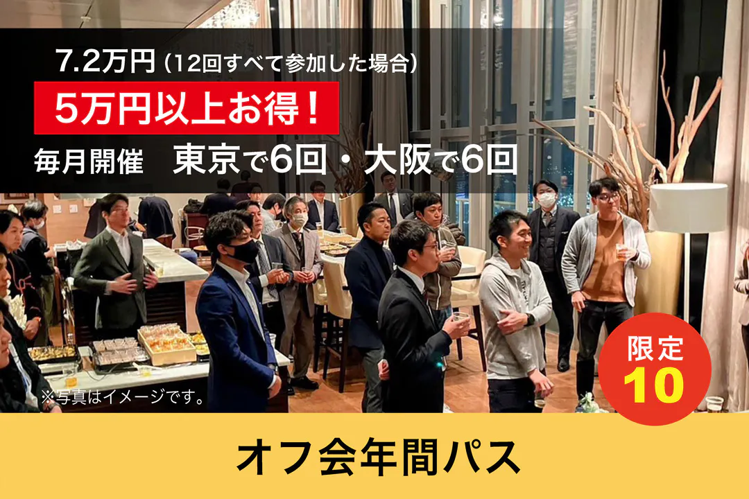毎月開催しているオフ会への年間参加パスです! 東京で6回、大阪で6回開催しています。 普段はオンラインでのやり取りをしている人たちと直接交流ができます。