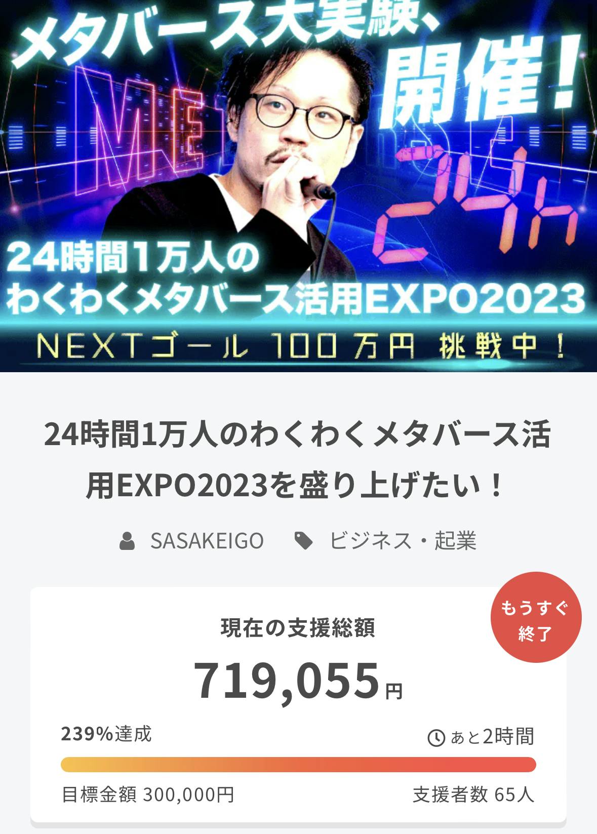 2023/04/29 12:27皆さん、クラウドファンディングのご支援と拡散のご協力誠にありがとうございました!残すところ、13時間となりました!このクラファンのご支援は非常にありがたく、顧問業を辞め時間を作ったものの、私の執筆作業も重なり、収入が無くなっている中での、無料イベントなので。イベント前に出会い、イベントで知り合い、イベント後に協力、協業し新しい価値を創造してもらいたい。そんな機会に出来れば非常に嬉しく思っております。ラスト13時間‼︎最後のお力添え、どうぞよろしくお願いいたします‼︎イベント告知の際、このイベントに出展します。このイベントに関わっています。などのメッセージと共に以下のURLを一緒投げてくださいませ。↓イベントの詳細はこちら↓https://camp-fire.jp/projects/view/657886#メタバース#SAMURAIバース#1万人メタ活用EXPOまた、メッセージに併せて出展者申込期限が4月30日となっています。こちらも、メッセージに添えていただければ幸いです。例えば、飲食店とメタバースの掛け算ってどうするの?という疑問があるなら、その疑問が課題であり、需要になると思います。供給者が多いなら需要展示ブースを出してみても良いと思っています。未だに出展を悩んでいる方は、その悩みブースを出してみて下さい。そして、同業者にお声がけしてください。もはや、日本で少ないパイを取り合うのではなく、世界にどうやったら貢献できるか、どうやったら世界に供給できるようになるかを同業者で話し合いルール自体変えに行きましょう‼︎どうぞ、よろしくお願いいたします。 もっと見る