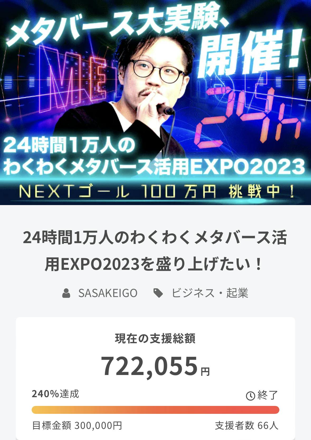 2023/04/30 09:01皆さん、クラファン期間中のご支援誠にありがとうございました。おかげさまで、66名の方から70万円(240%)を超える支援額を達成することができました。この勢いをそのまま、それ以上にして、5月17日18日の1万人のわくわく24時間メタバース活用EXPOを盛り上げて参ります。引き続き、どうぞよろしくお願いいたします‼︎ もっと見る