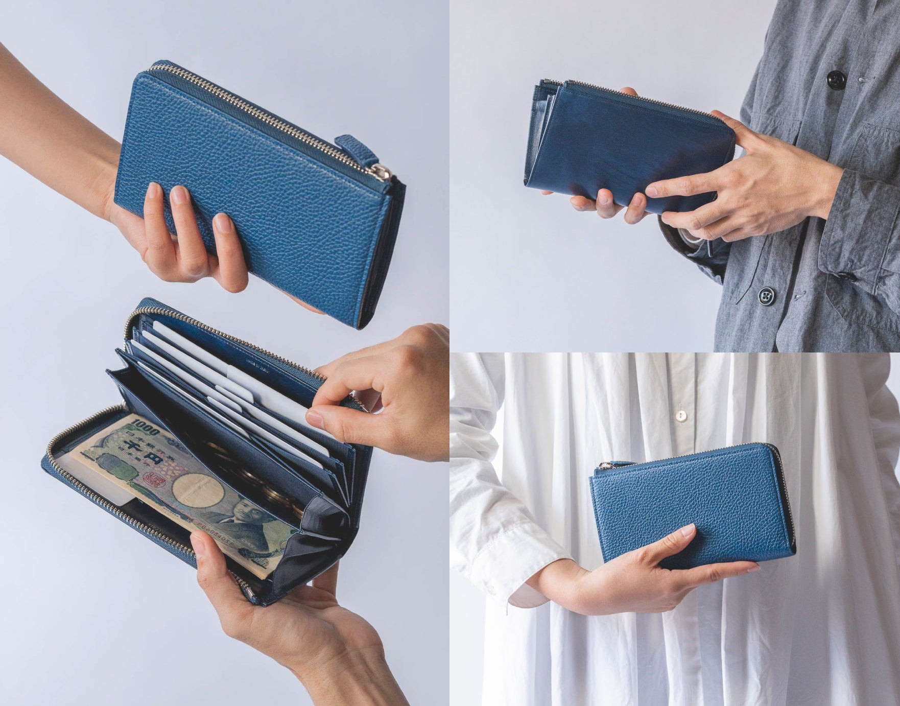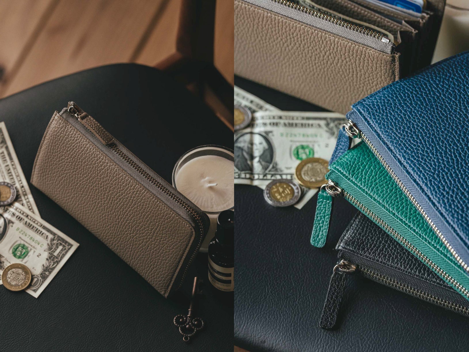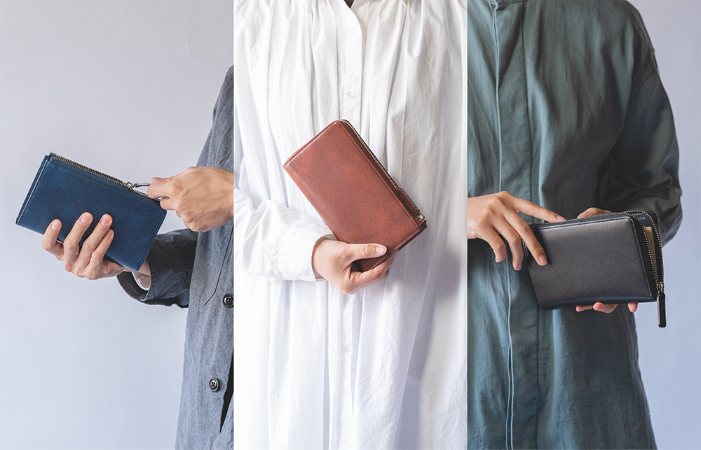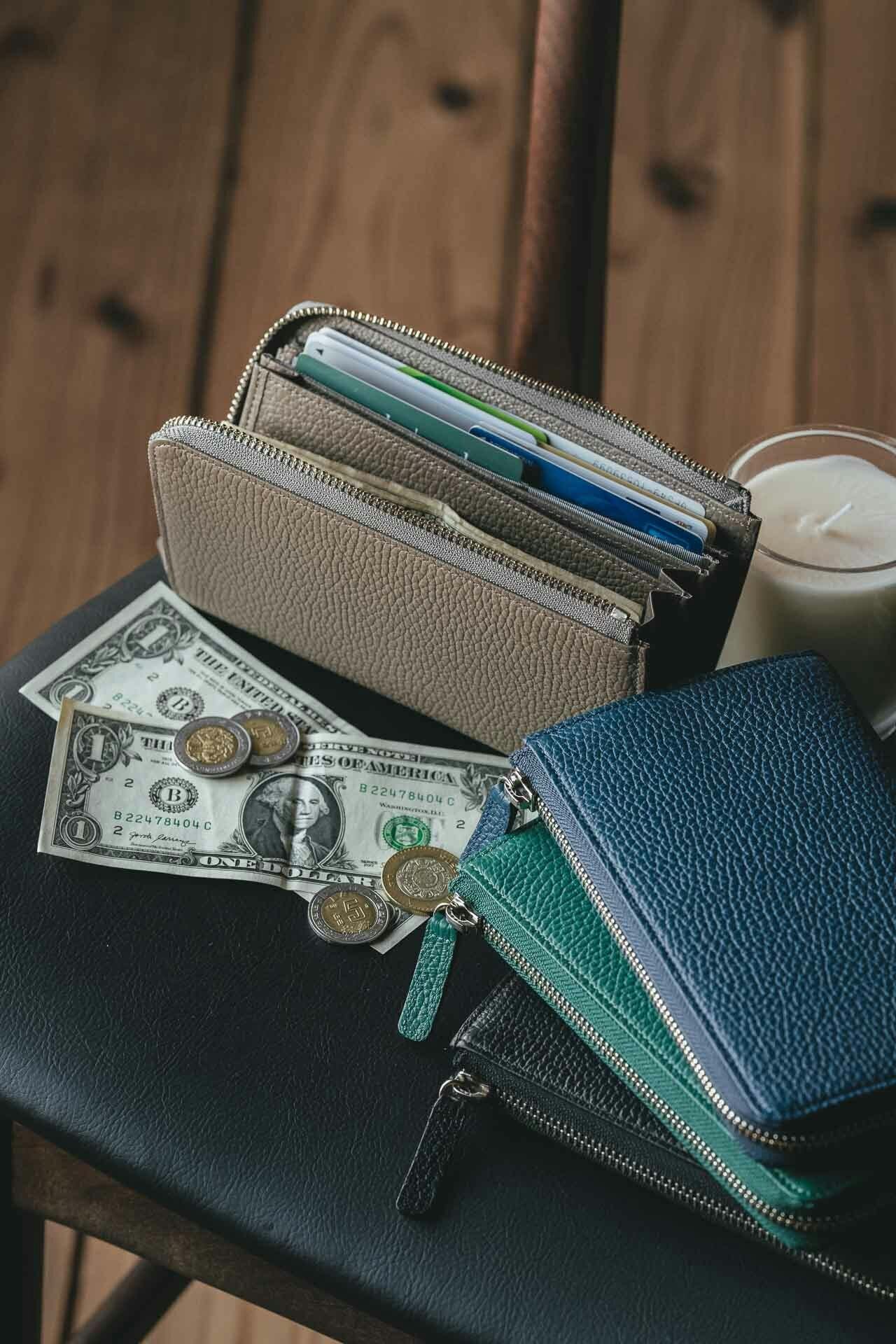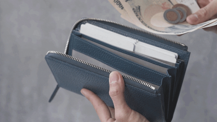 特に、小銭やカード、お札を最大限に入れた時にも、ファスナー部分が歪むことなく直線で美しく見えるようにこだわりました。