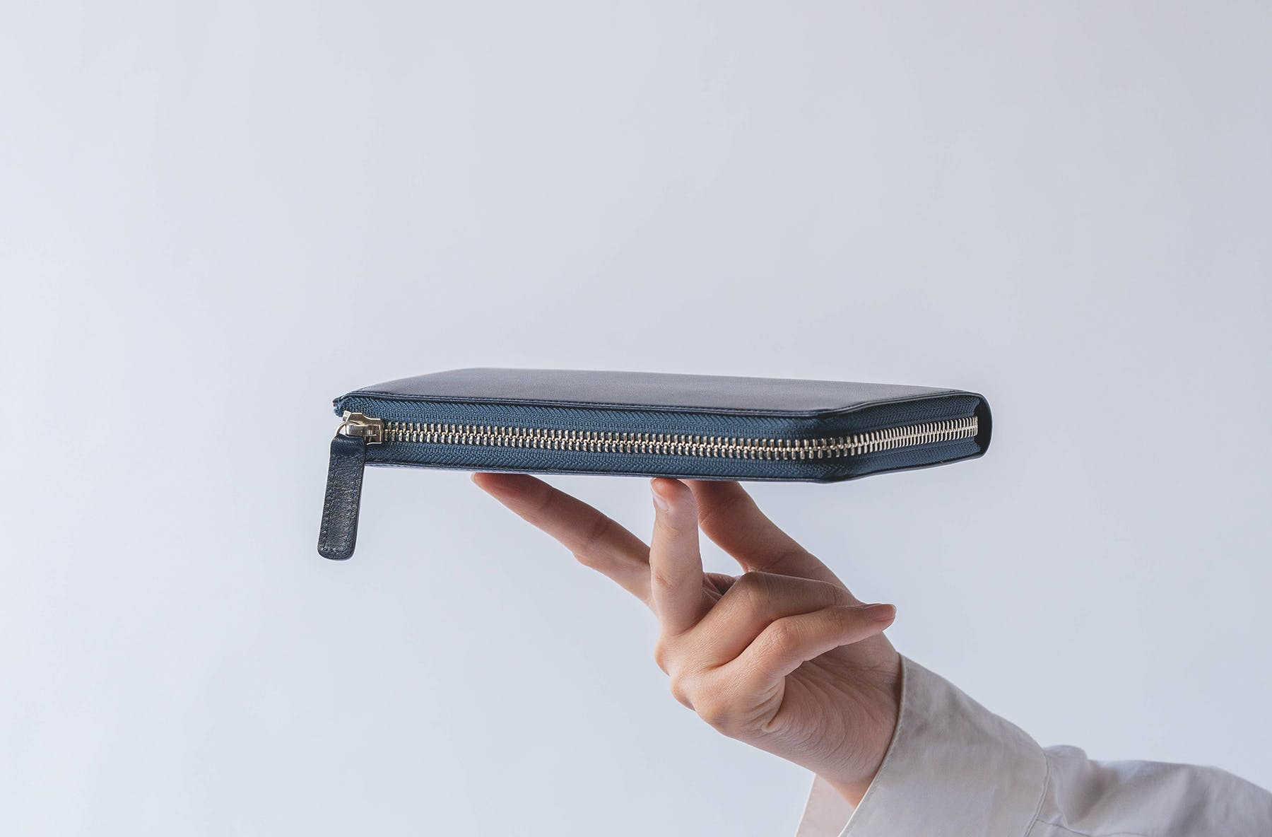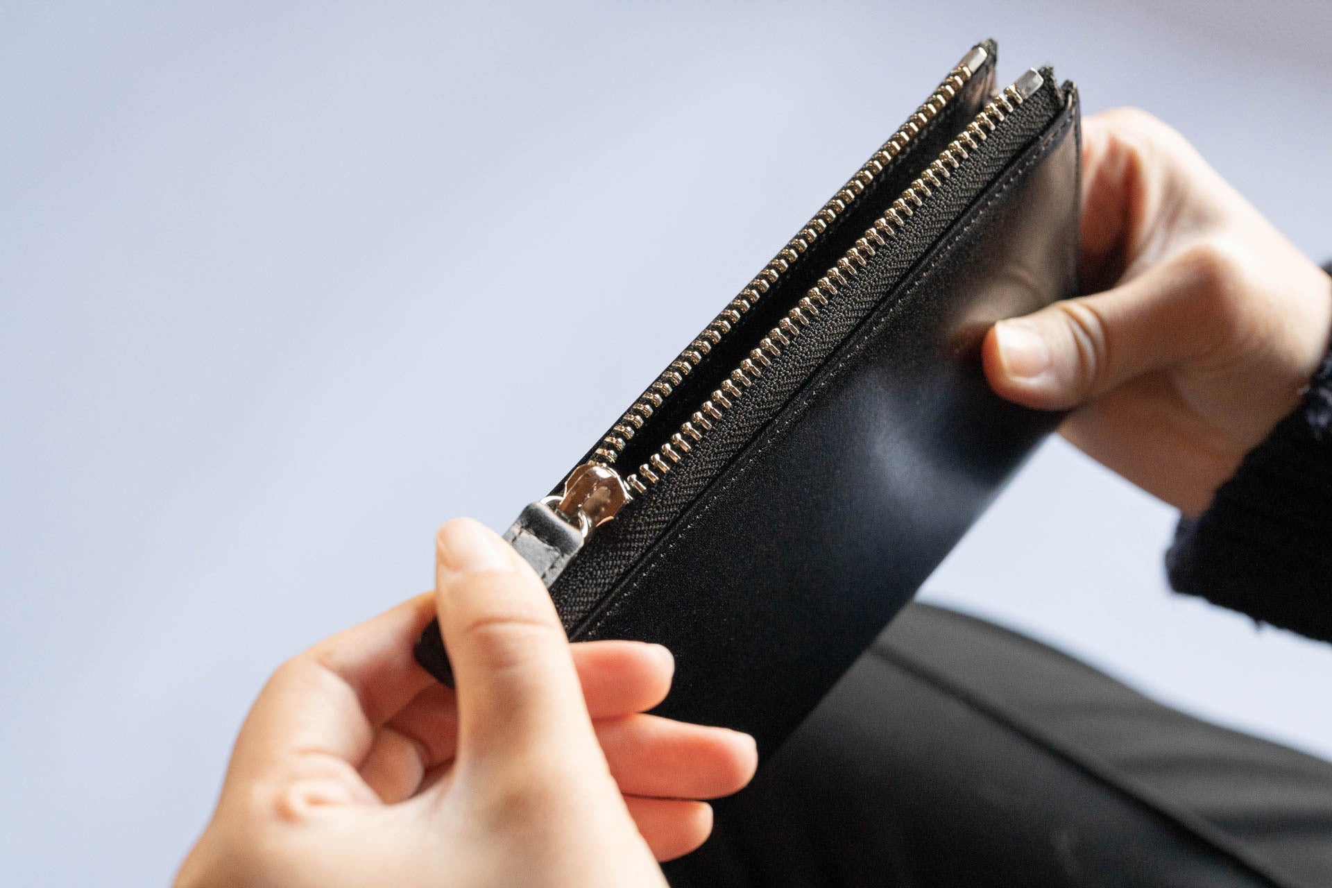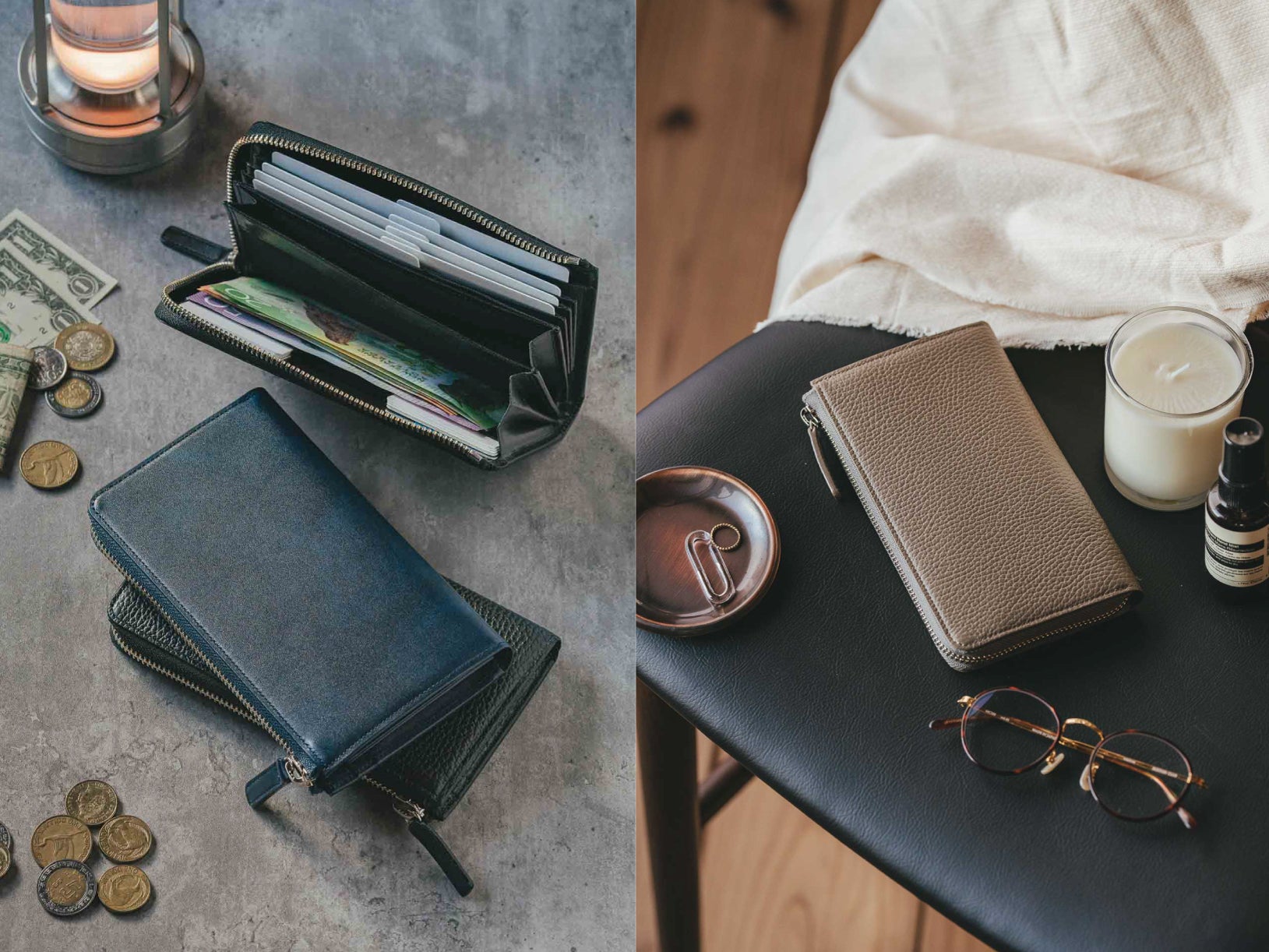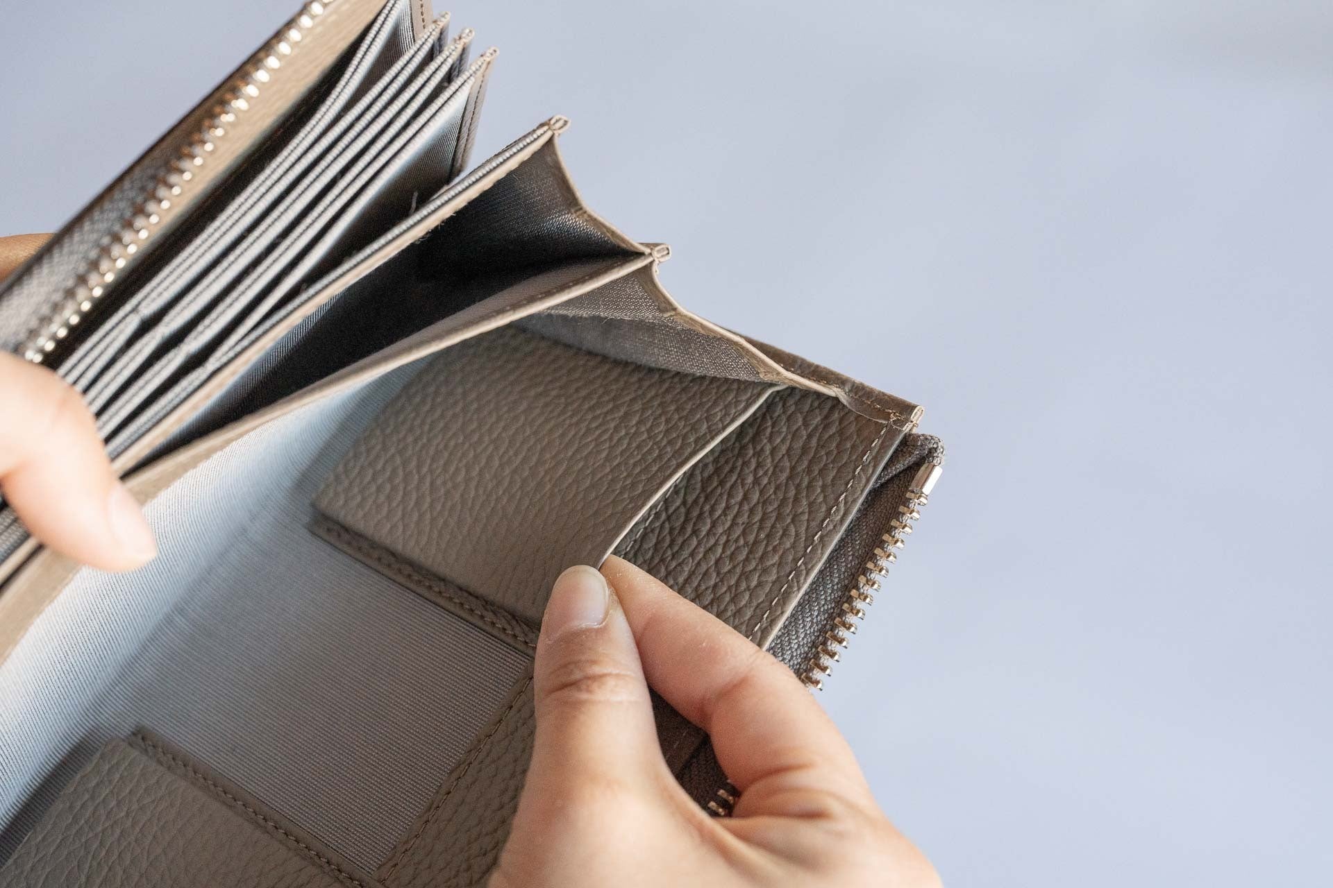 特に、小銭やカード、お札を最大限に入れた時にも、ファスナー部分が歪むことなく直線で美しく見えるようにこだわりました。