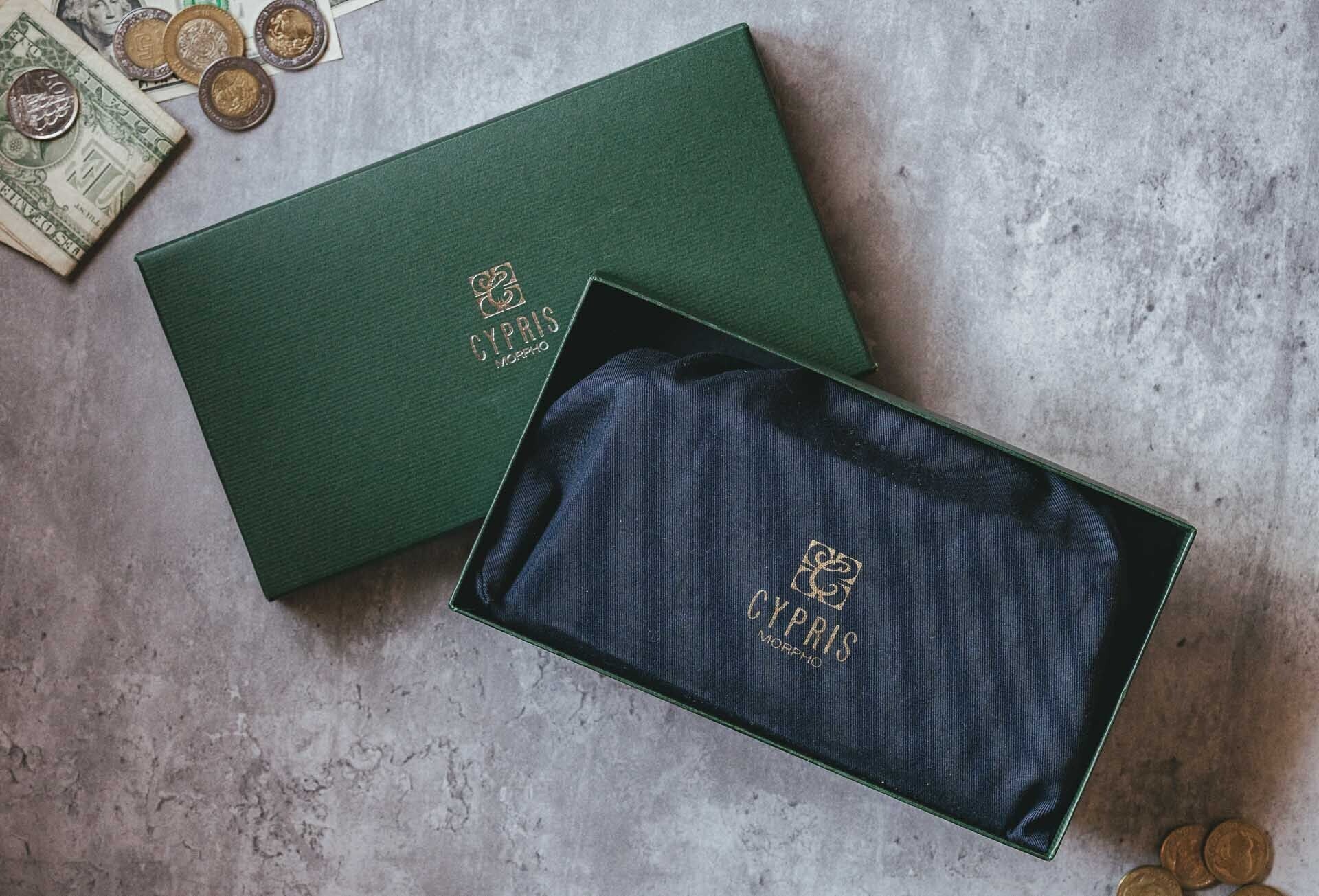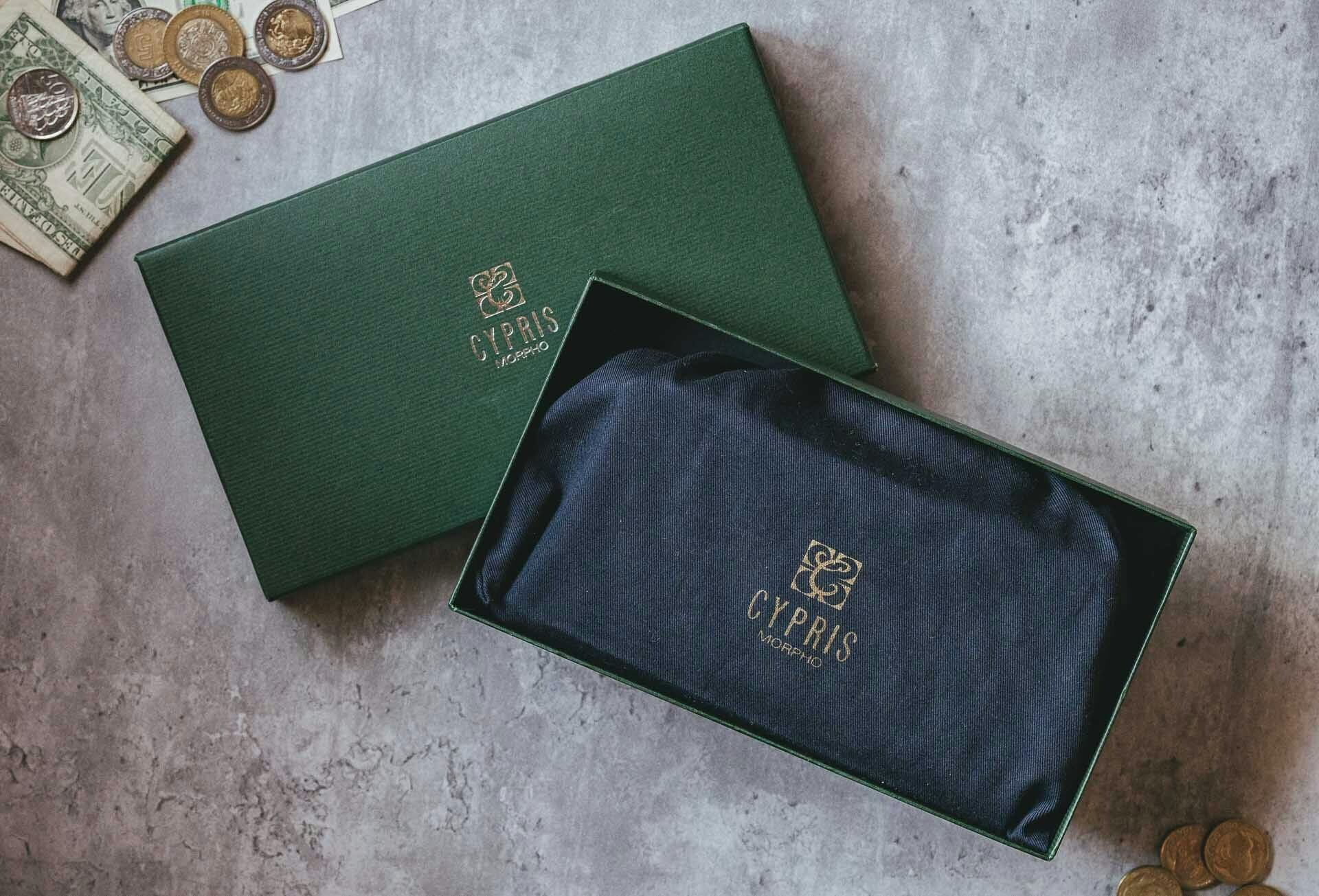 落ち着いたグリーンの化粧箱に「CYPRIS」のロゴがあしらわれた上品なデザインのパッケージ。