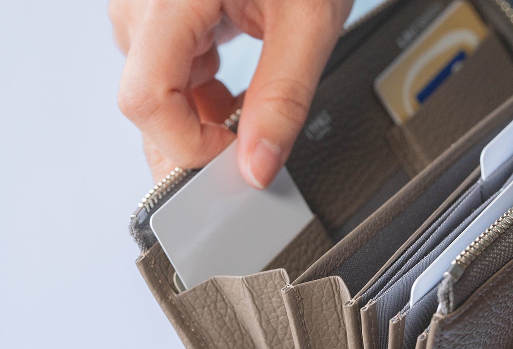 今回、本機構をコンパクトな財布のサイズに合わせ、小さく再設計。カードが交互に立ち並び、一覧で見ることができるうえ、2本の指でサっと取り出せます。