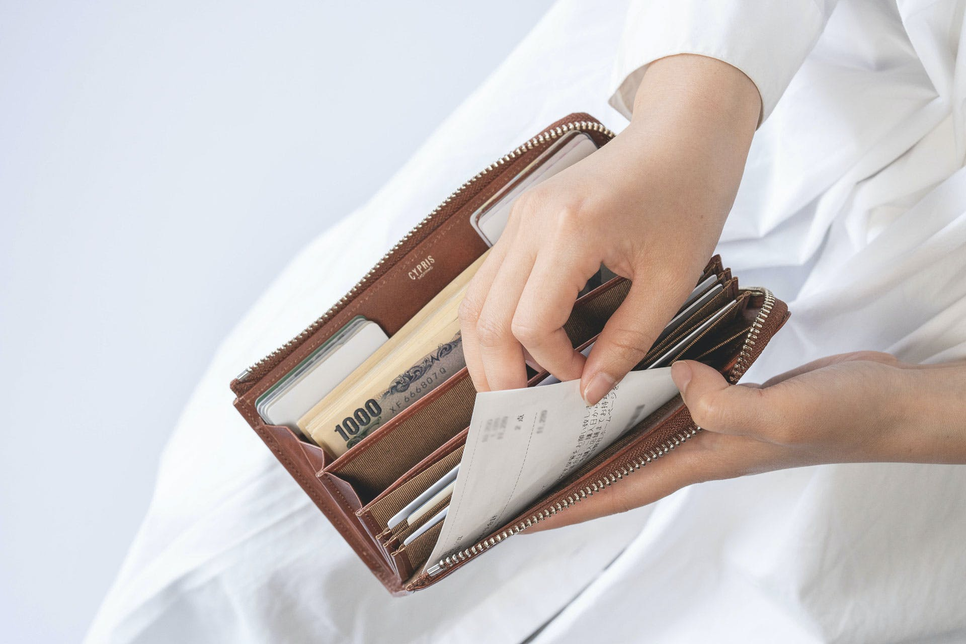 領収書はお札と一緒に紙幣の収納スペースに入れても良いですし、領収書スペースを活用して見えないように収納するのも、どちらもおすすめ。