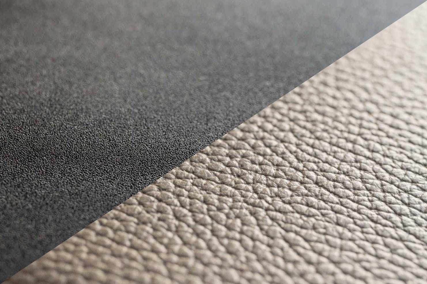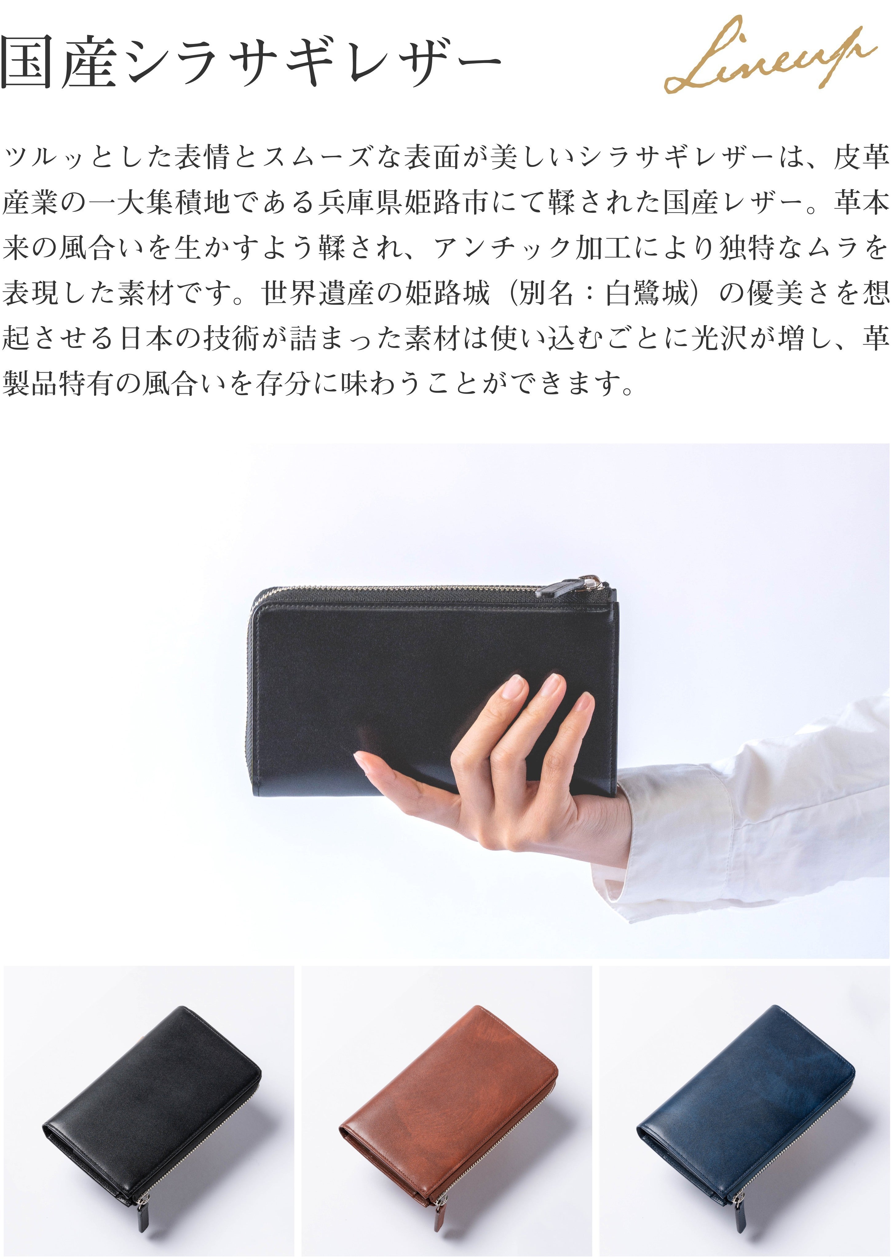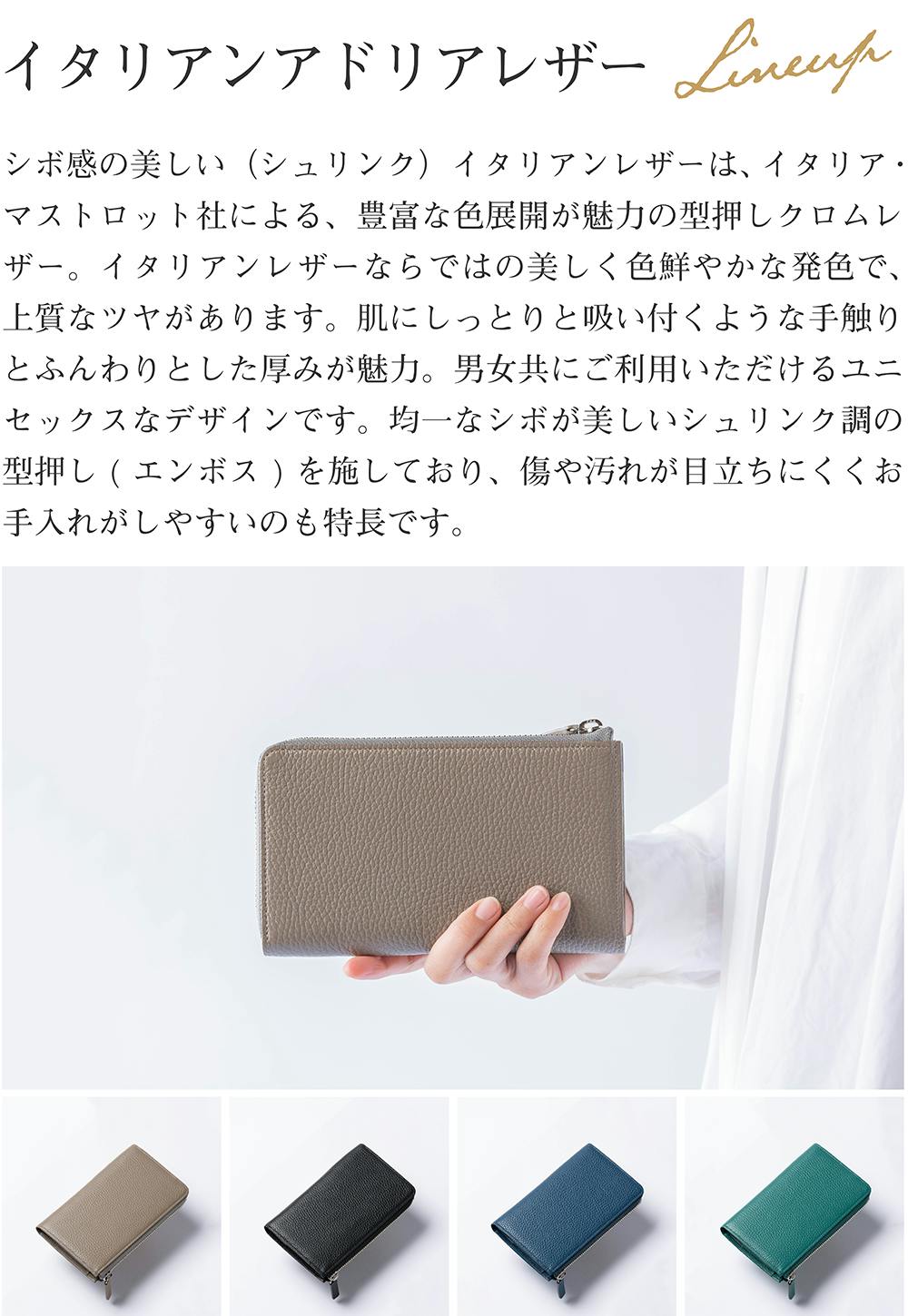 フラットで光の反射が美しい国産シラサギレザーと、レザーらしいシボ感と柔らかさのあるイタリアンアドリアレザーの展開。どちらも牛革です。