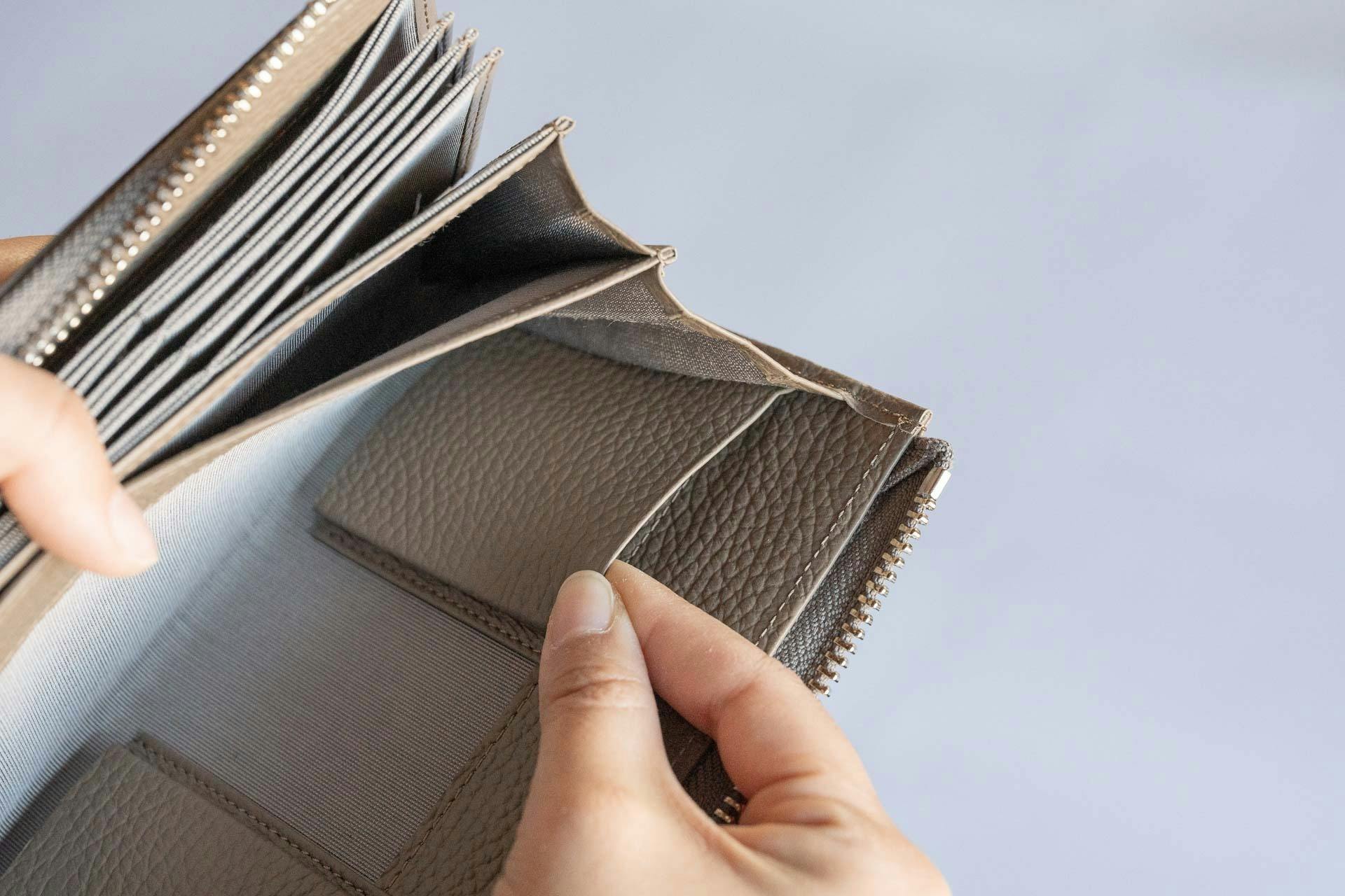 また、大容量でありつつ、できる限りコンパクトにするため、小銭ポケット部分がカード室と干渉しない構造を採用。