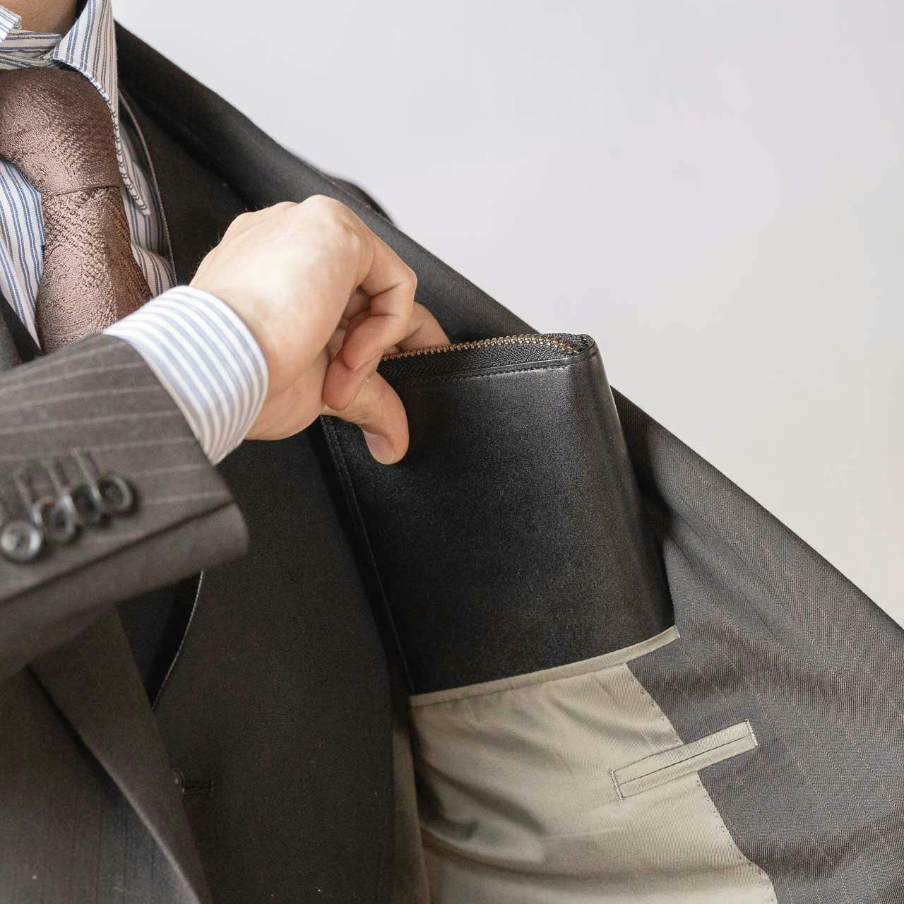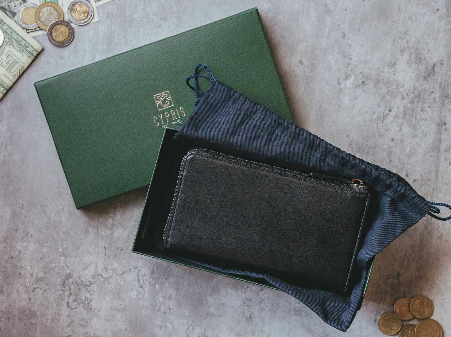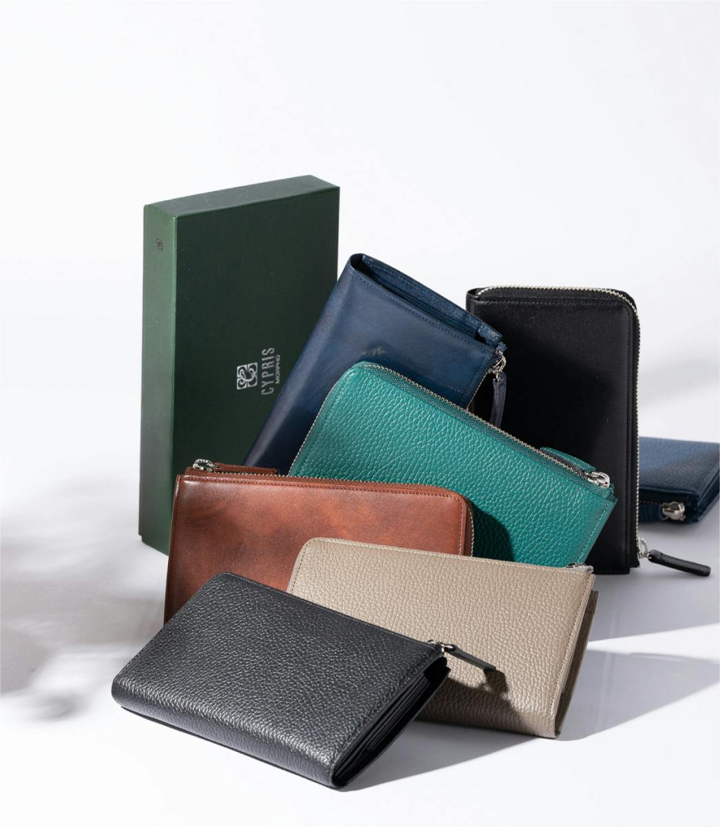 「CYPRIS」では細かなパーツを含め、ほとんどの革に裏地や芯材を採用しています。そんなモノづくりから生まれる財布は、ピンと張りのある上品でフォーマルな装いに。スーツに合うような美しい「仕立て」が特長です。