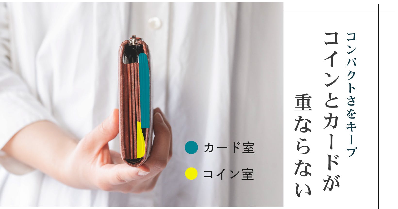 カードと小銭が重ならず、小銭の厚みがカード室下のスペースに逃がせる、中身を入れても膨らまない構造を採用しています。
