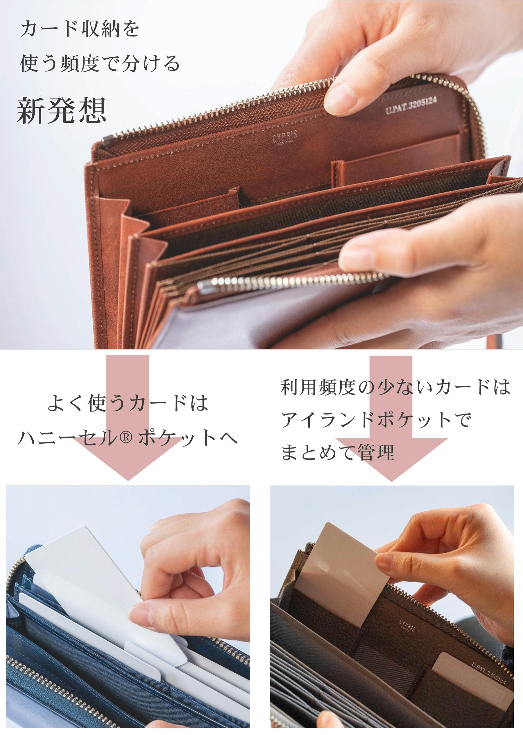 メインのカード収納に採用したハニーセル®構造は、カードが取り出しやすいと定評があり、累計販売実績数21万個以上にのぼるCYPRISの独自構造。