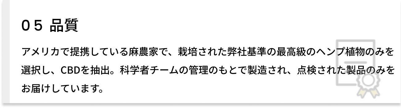 弊社が輸入するCBD水溶液はアメリカで400店舗以上広がっていることもあり、お客様からの信頼とブランドを最も大事にしています。