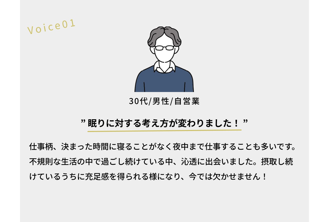 睡眠の質が良くなることで、身体のだるさもなくなり、活力がわき、仕事が捗るようになりました。