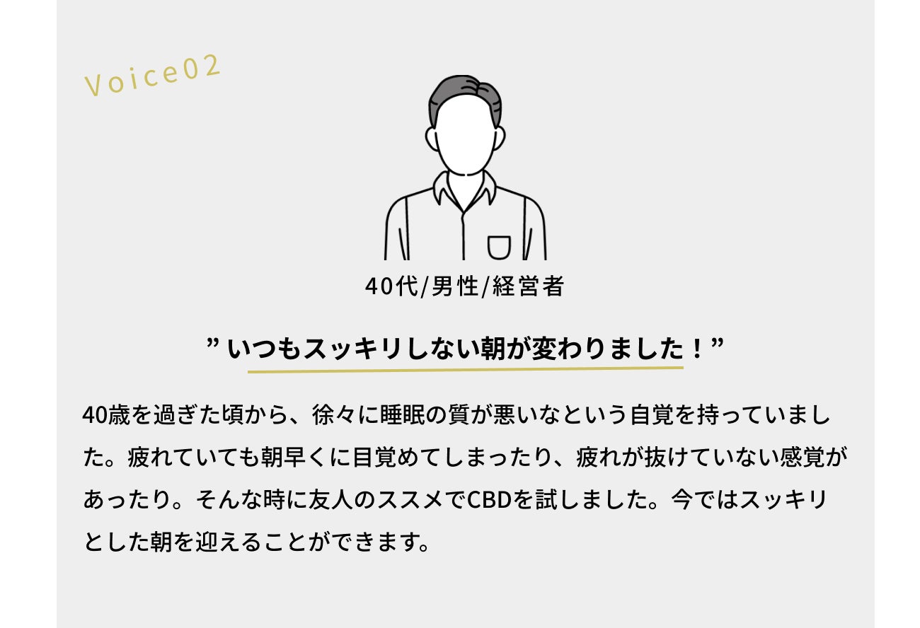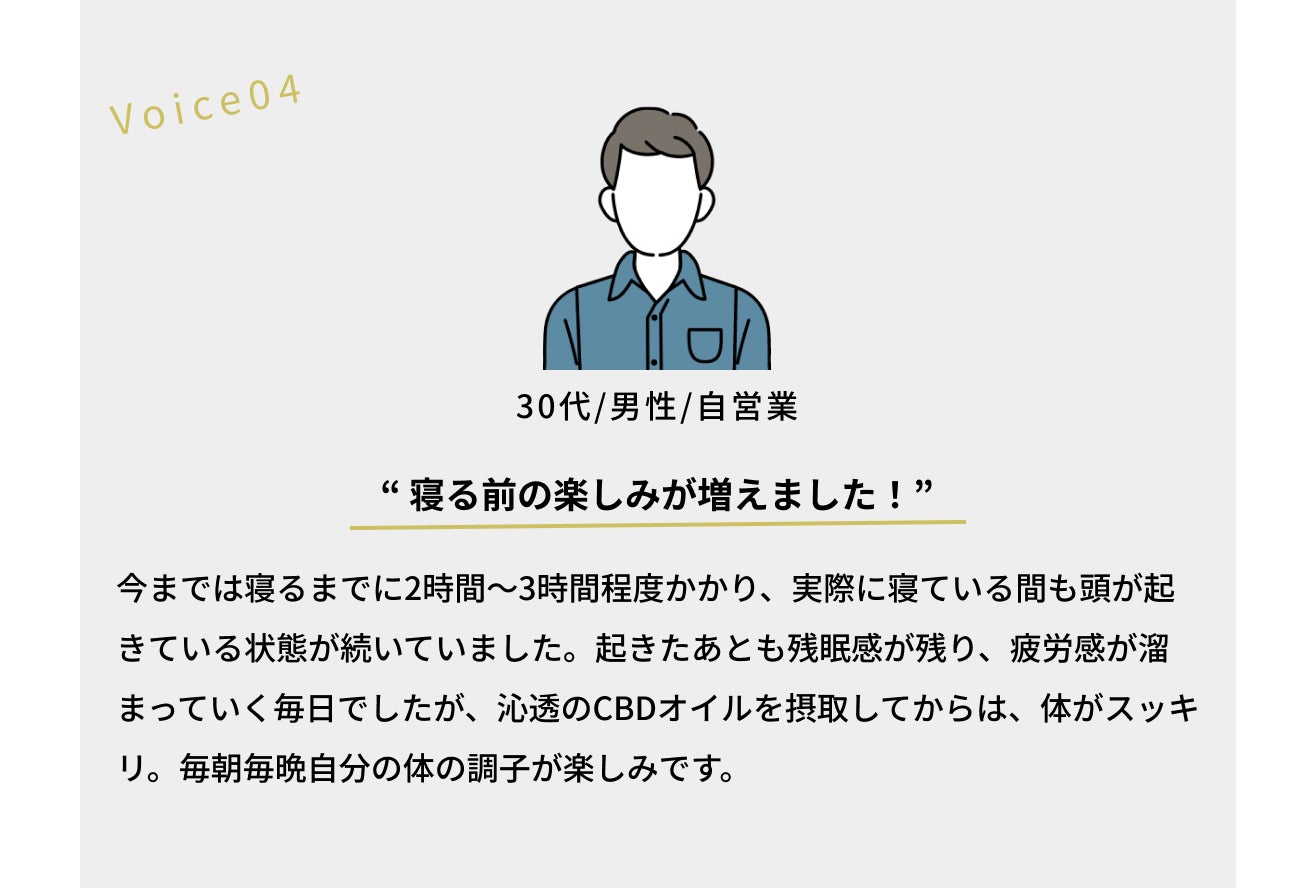 ですが、ある時友人の紹介で出会ったアメリカでCBD製品を扱っている方(現在沁透の役員)との出会いで、大きな転機を迎えました。もともとCBDというものを知らなかった私は、CBD水溶液が睡眠の質の改善に良いことを教えてもらい、アメリカで販売されている商品を送っていただきました。