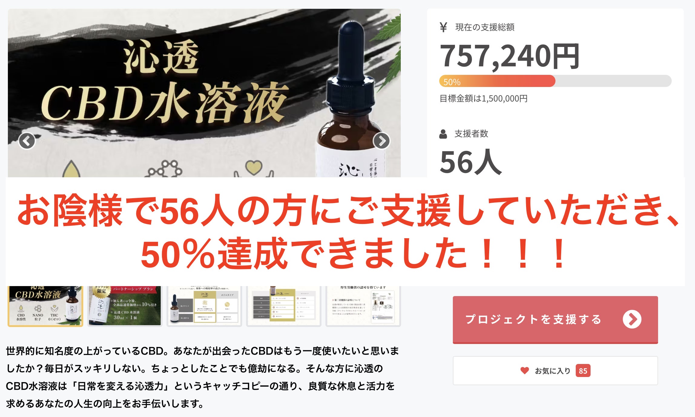 2023/06/22 09:005月15日にスタートしたクラウドファンディングですが、皆様のお陰で56人の方にご支援いただき、50%を達成することができました。5月22日には展示会に出展をし、約400名が参加するイベントに出展をすることができました。また、現在沁透のブランド動画、商品PR動画、商品比較動画を作成しております。皆様に深くCBDを知っていただくために様々なコンテンツを準備しておりますので、完成次第ご報告させていただきます!!引き続き応援のほどよろしくお願いいたします。 もっと見る