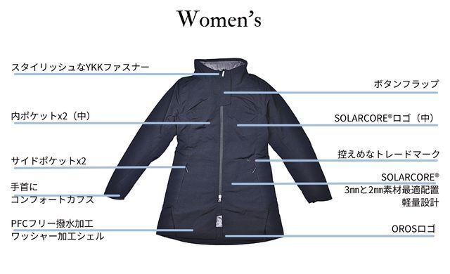 『オリオンシティコート』は-40℃環境下でも体温を保つ、OROSブランドで唯一3ミリ厚の断熱素材SOLARCORE®を使用するシティ向けコートです。