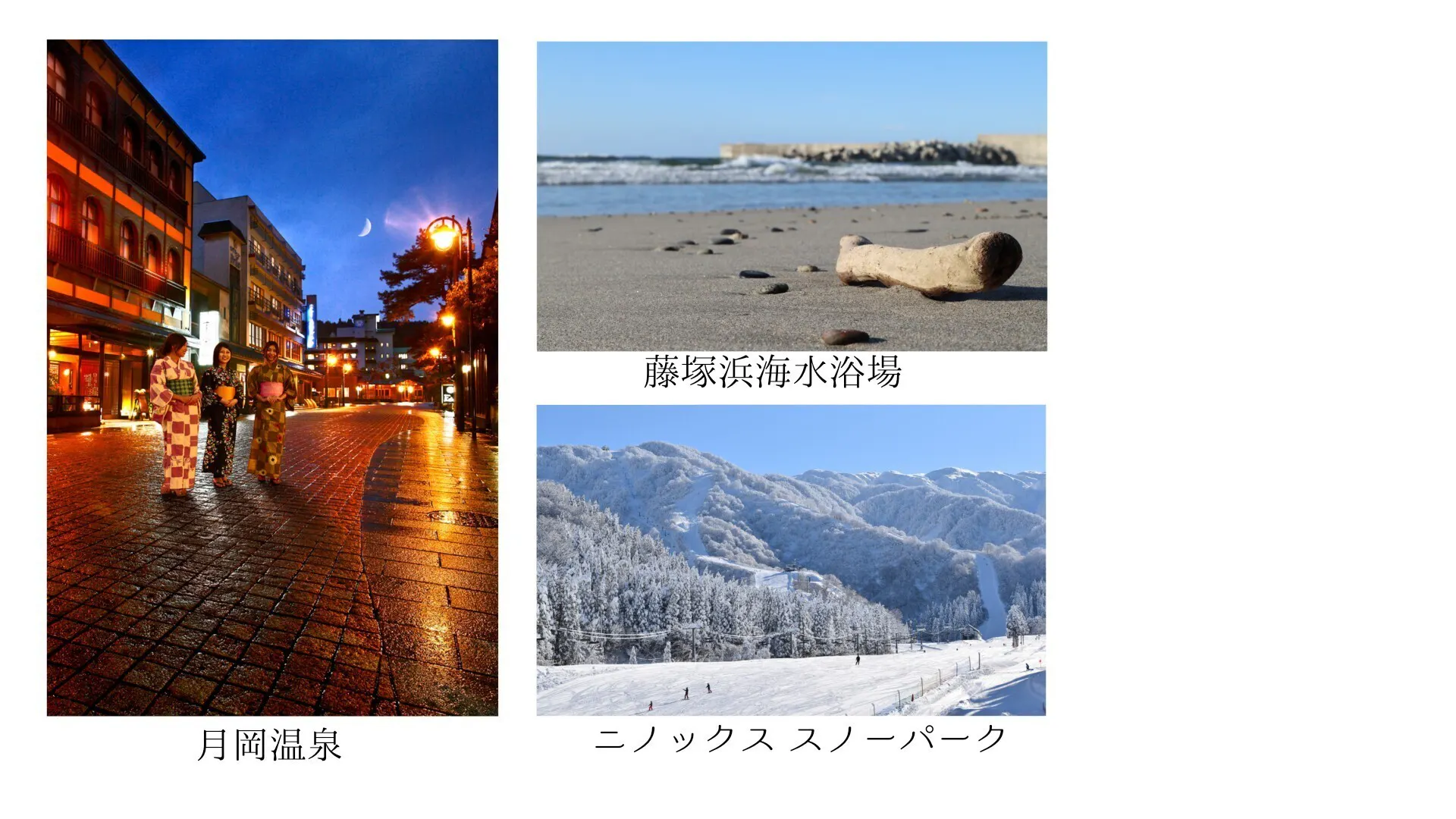 全国的にも有名な「月岡温泉」や、四季を通じて楽しめる山から海までの豊かな自然など、観光資源がとても充実しています。