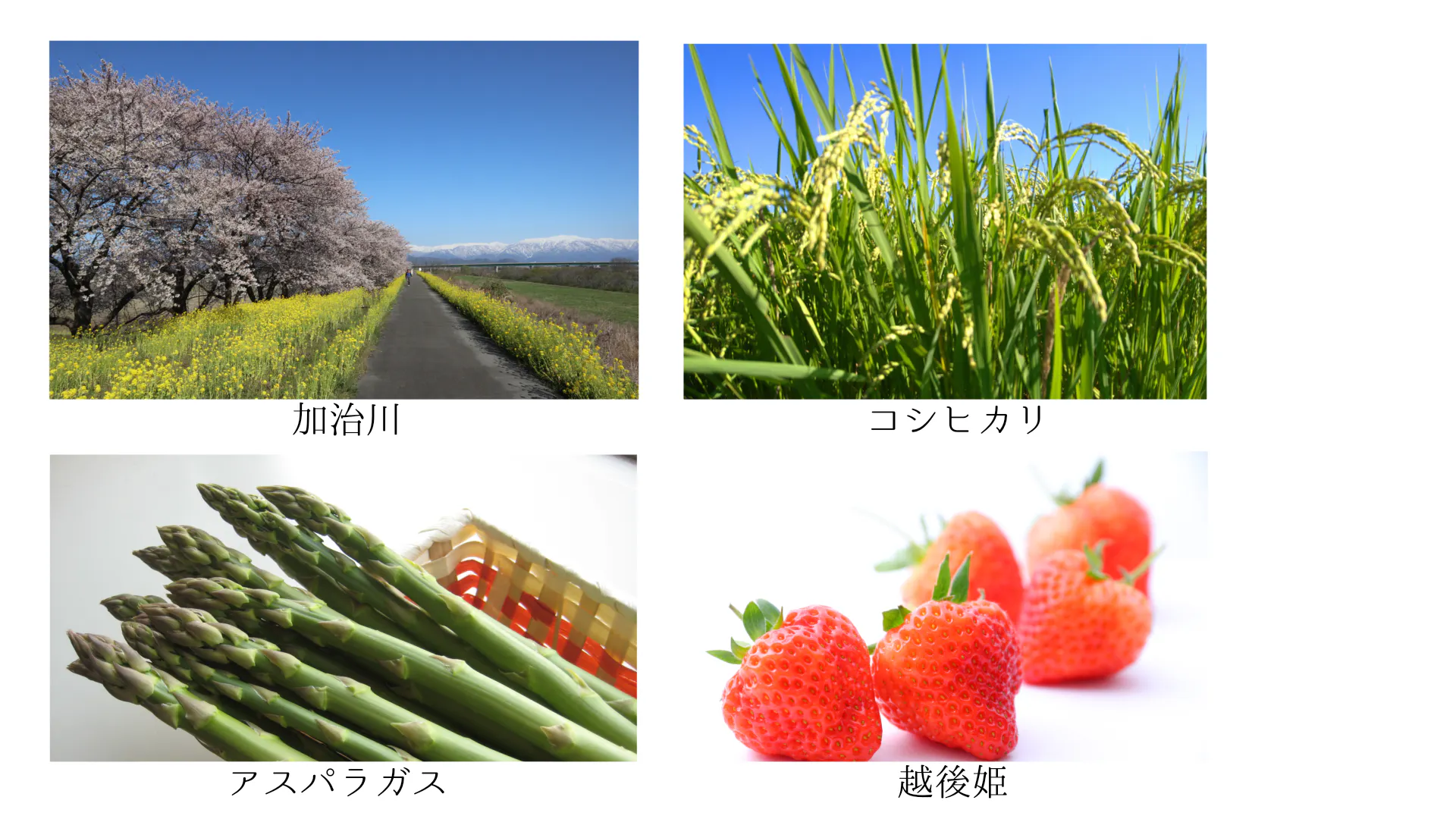 また、かつて東洋一といわれた堤桜を有する「加治川」が潤す土地の恵みを受け、「コシヒカリ」や「アスパラガス」、「越後姫」などの農産物の、県内有数の産地です。また、「パイオニアポーク」や、「新発田牛(しばたうし)」は新発田の誇る高品質ブランドとして人気を博しています。