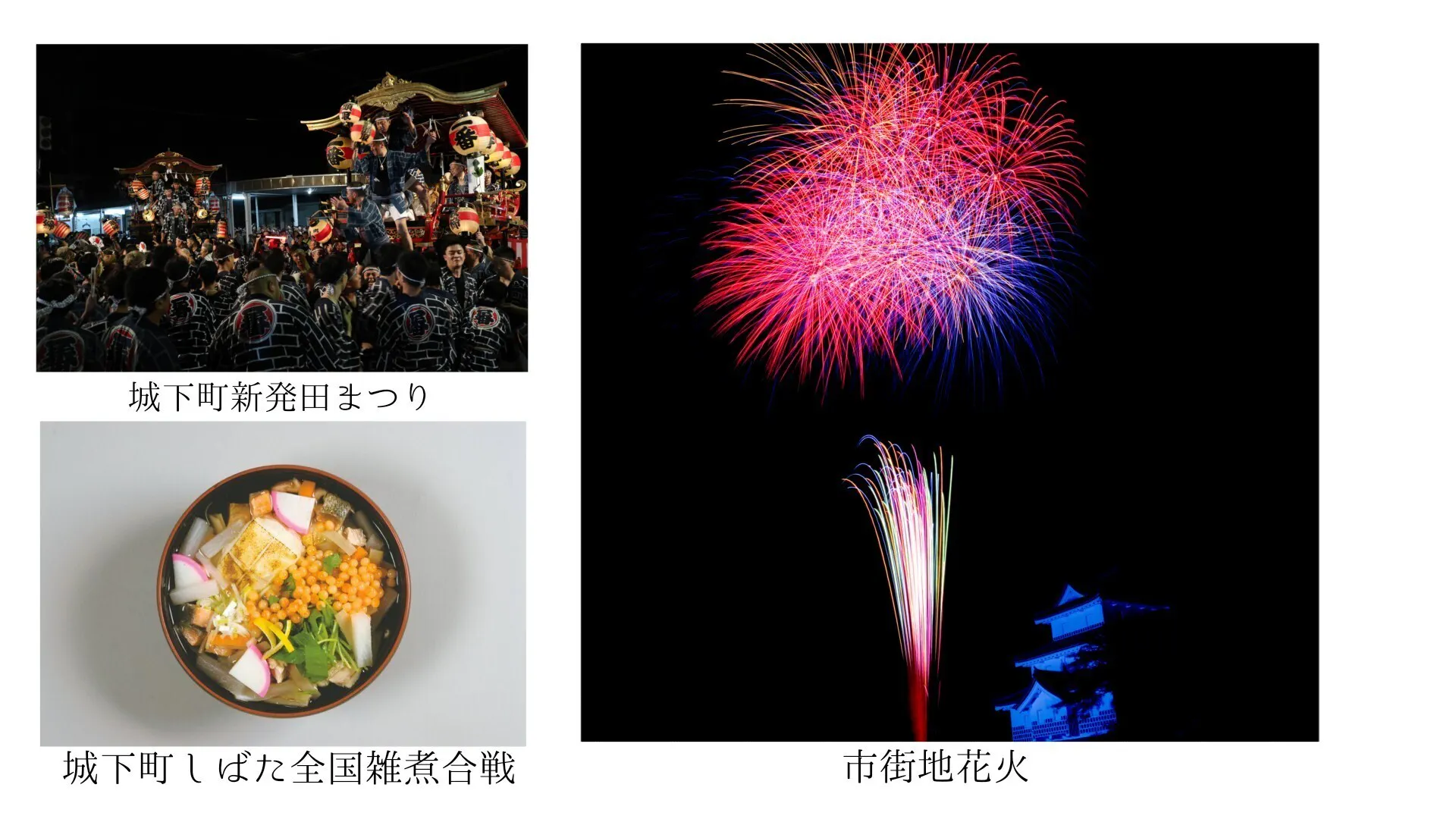 新発田は季節の催し物も盛んな地域で、夏には「城下町新発田まつり」、冬には「城下町しばた全国雑煮合戦」と大きなイベントが開催され、県内外からもたくさんの観光客が訪れています。