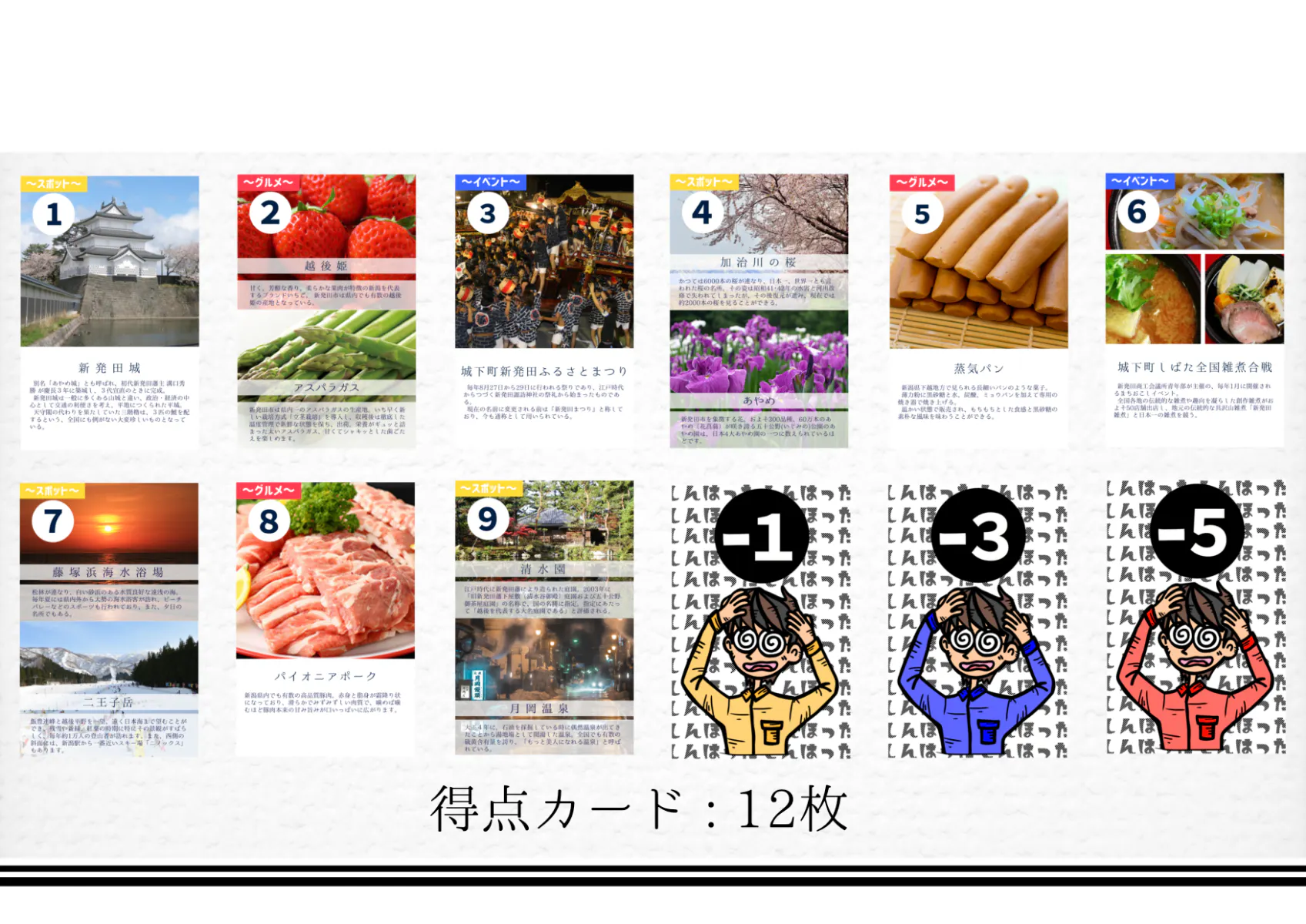 手札の数字カードと特殊カードを駆使して、新発田の観光・名産品(得点)のポイントを一番多くゲットできた人が勝利できる、運と駆け引きを楽しめるスリリングな頭脳ゲーム☆