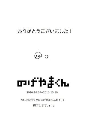 2016/10/10 22:05「ちいさなポッケにのげやまくん 6(:D」、無事に終了することができました。 「のげやまくんをおとなりへ」のパトロンの皆さん、最後までお付き合いいただき本当にありがとうございました。 皆さんのおうちののげやまくんは元気にのげのげしているでしょうか。 時々、一緒におでかけしてあげてくださいね。 すごく喜ぶと思います。 のげやまくんは皆さんと遊びたくて仕方がないのですから。 ・・・・・・・・・ それではまた何かありましたら、大変不躾ではありますが、またお知らせさせていただければと思います。 今回も支援してくださった皆さん、応援してくださった皆さん、本当にありがとうございました。 失礼致します。 のげー...☆6(:D もっと見る