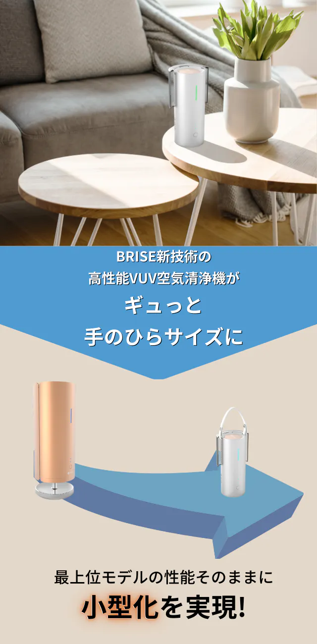 BRISE新技術のVUVライトで、清掃や交換が必要なフィルターを使用せず、次世代空気清浄機です。