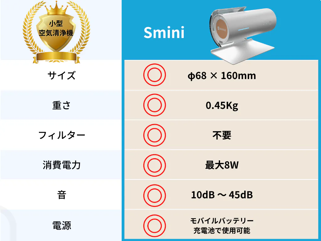 【Smini】は置く場所に困らず持ち運びに便利なコンパクトボディながら、強力パワーでキレイな空気を放出。