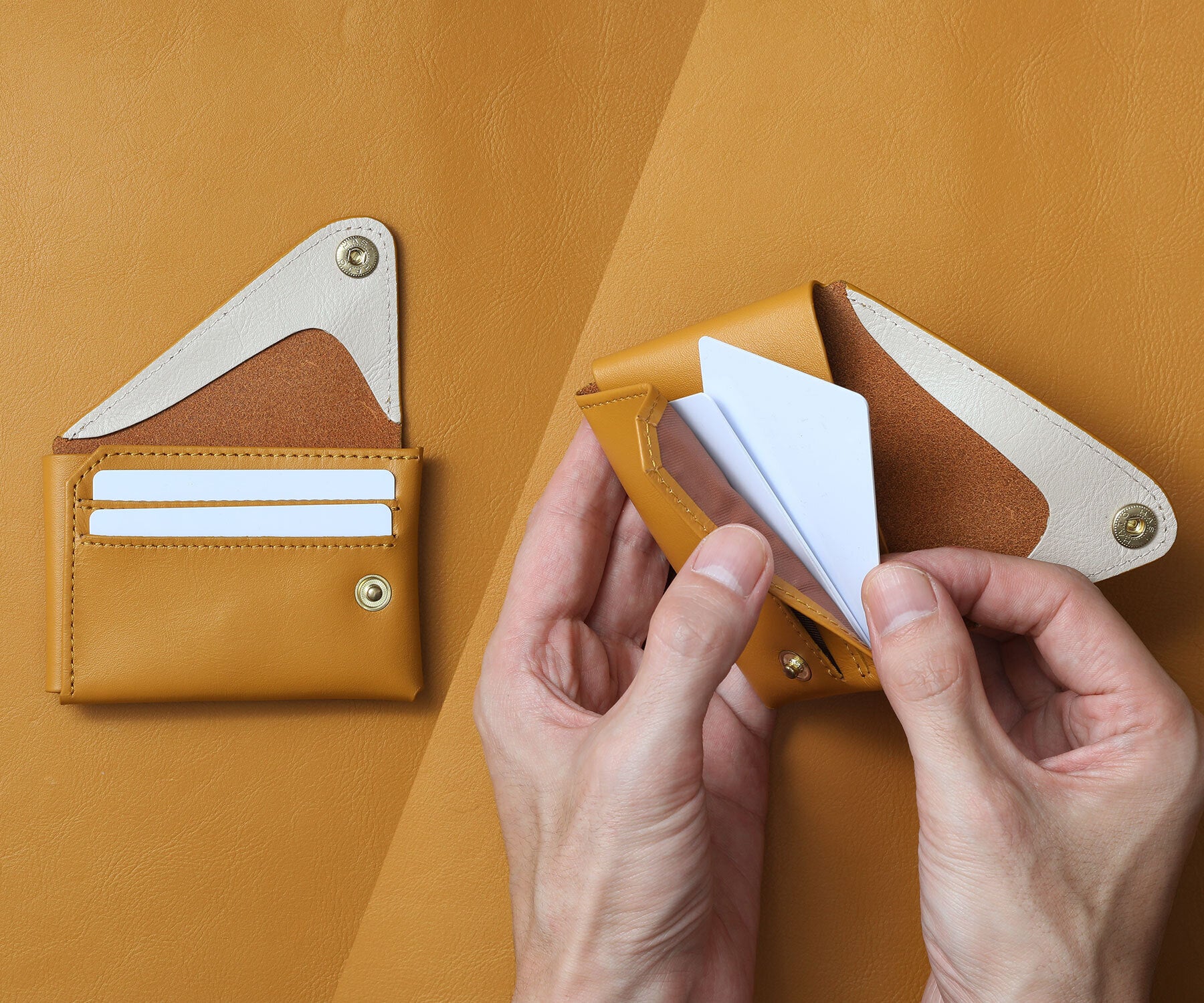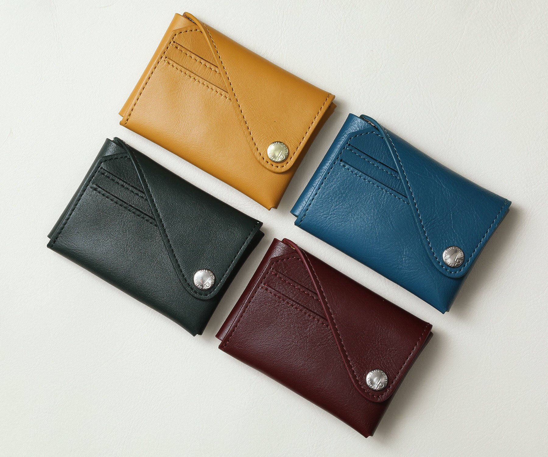 A:ウォレットが正しく折りたたまれ、すべての留め具が閉じている場合、カードが落ちることはありません。