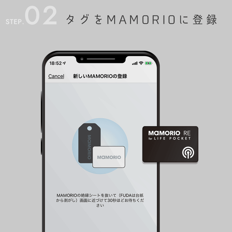 MAMORIOアプリを起動して、新しいMAMORIO REを登録します。※タグにはあらかじめ絶縁シートが挟まれておりますので、そちらを抜いてご登録ください。