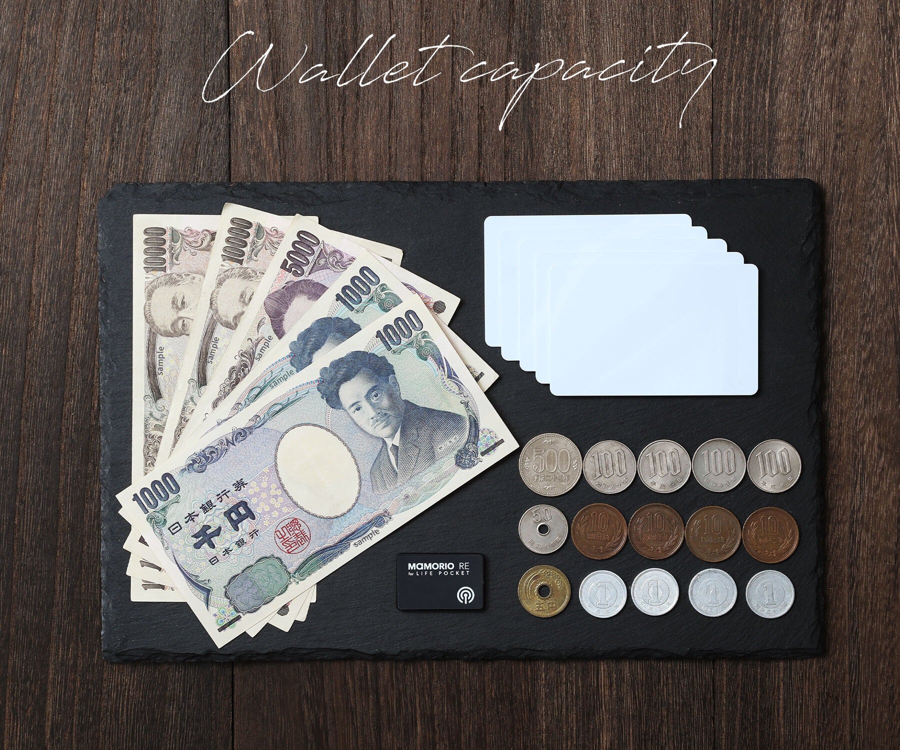 快適にご利用いただける容量は硬貨15枚、カード6~7枚、紙幣5~6枚。