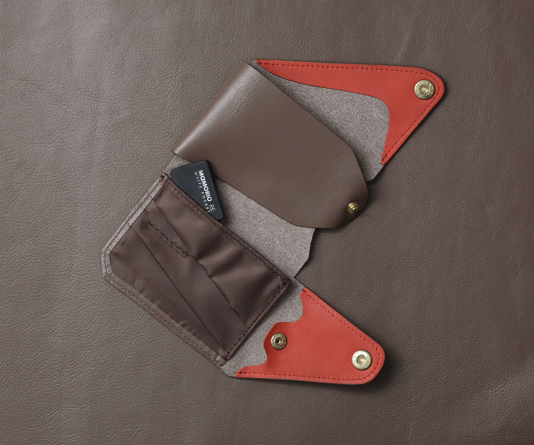 奥に入ったカードもすぐに取り出せるように、フラップ部分を少し引っ張る事でカードが押し出されてくるプルタブ機構を採用しました。