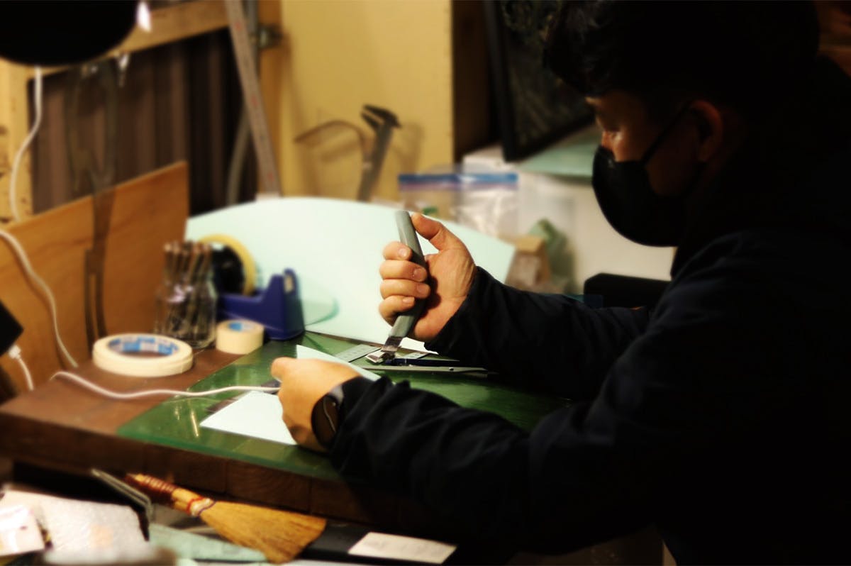 工場には普段大切に使われている道具や機械が沢山あり、そのどれもがオーラを纏っているようでした。特に職人さんが使う革包丁の柄の部分は、職人自らが手で削り、手に馴染ませた革包丁で作業を行っていました。こういった所は工場に行かなければ絶対に見れない光景です。