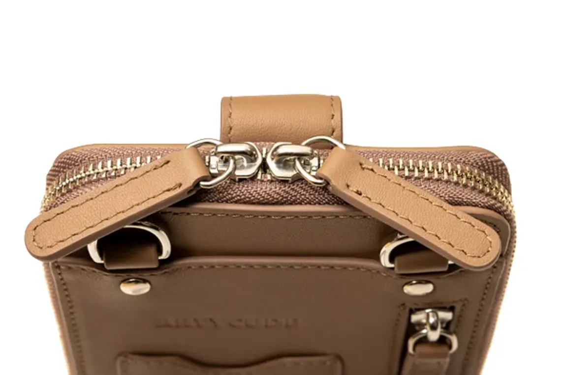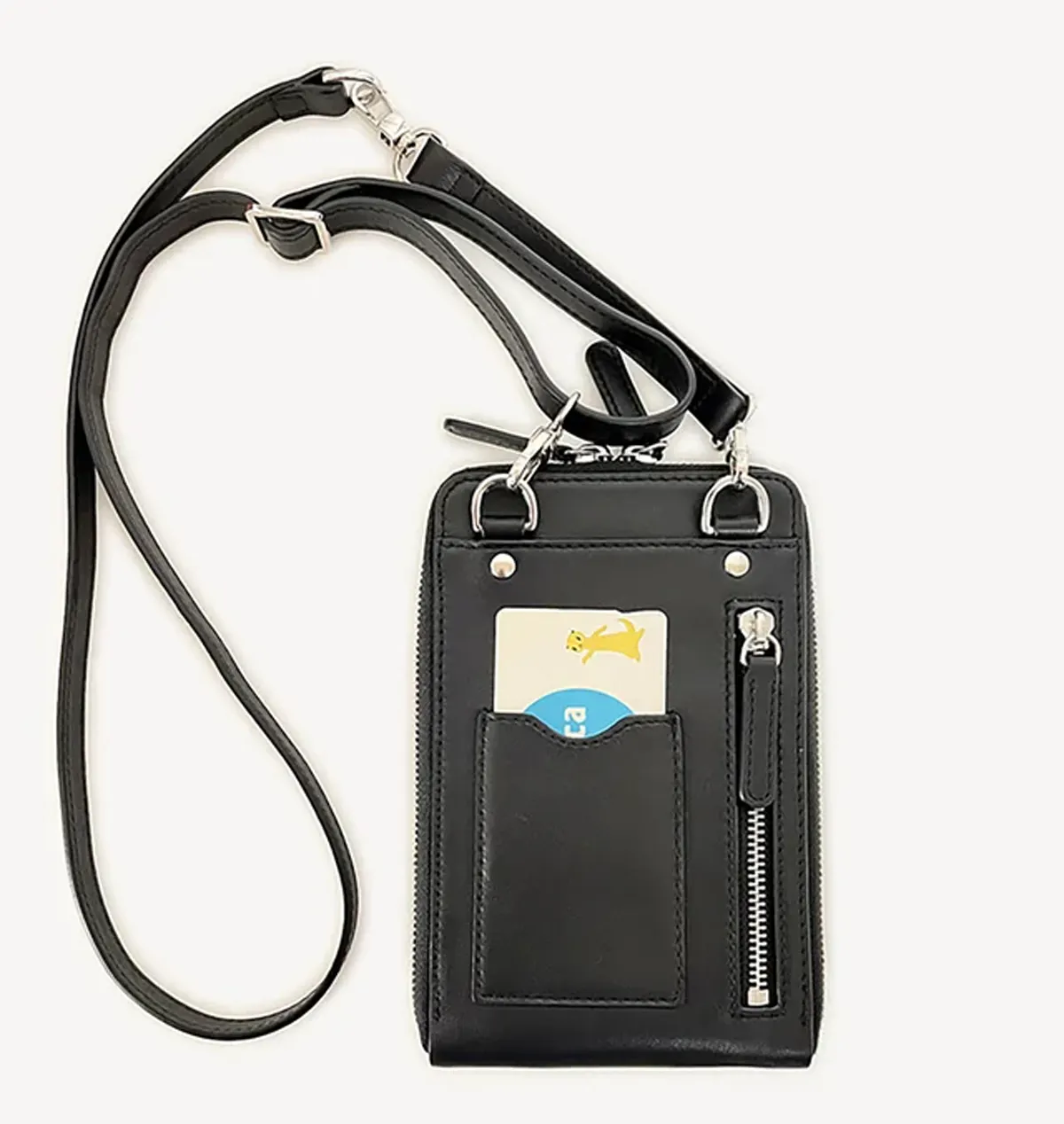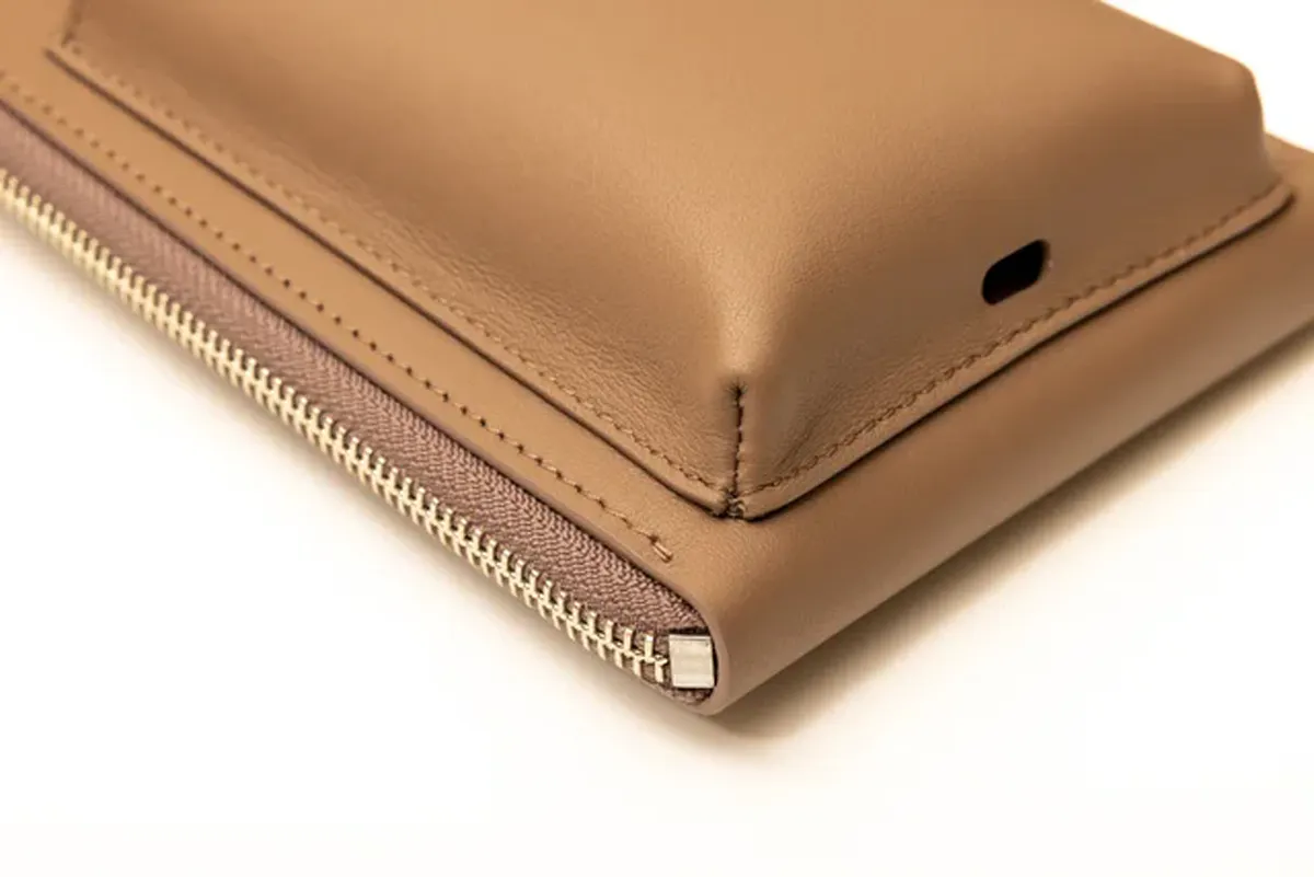 カード、紙幣、コイン、キー、パスポートなど全ての物が一度に取り出しやく見やすい構造にし、背面には交通カードポケット、マスク、カードなど入れられるZIP付ポケットを取り付けました。
