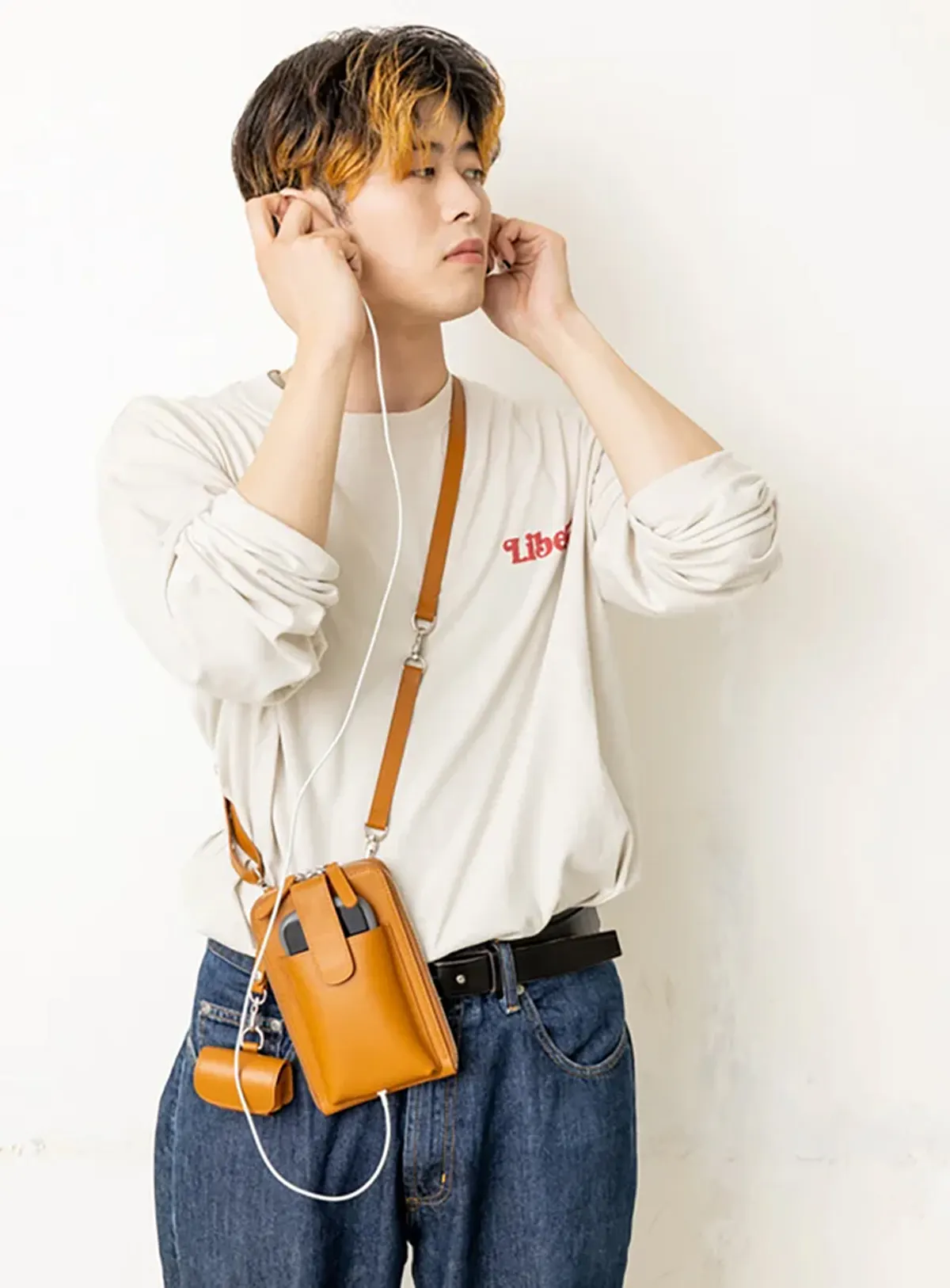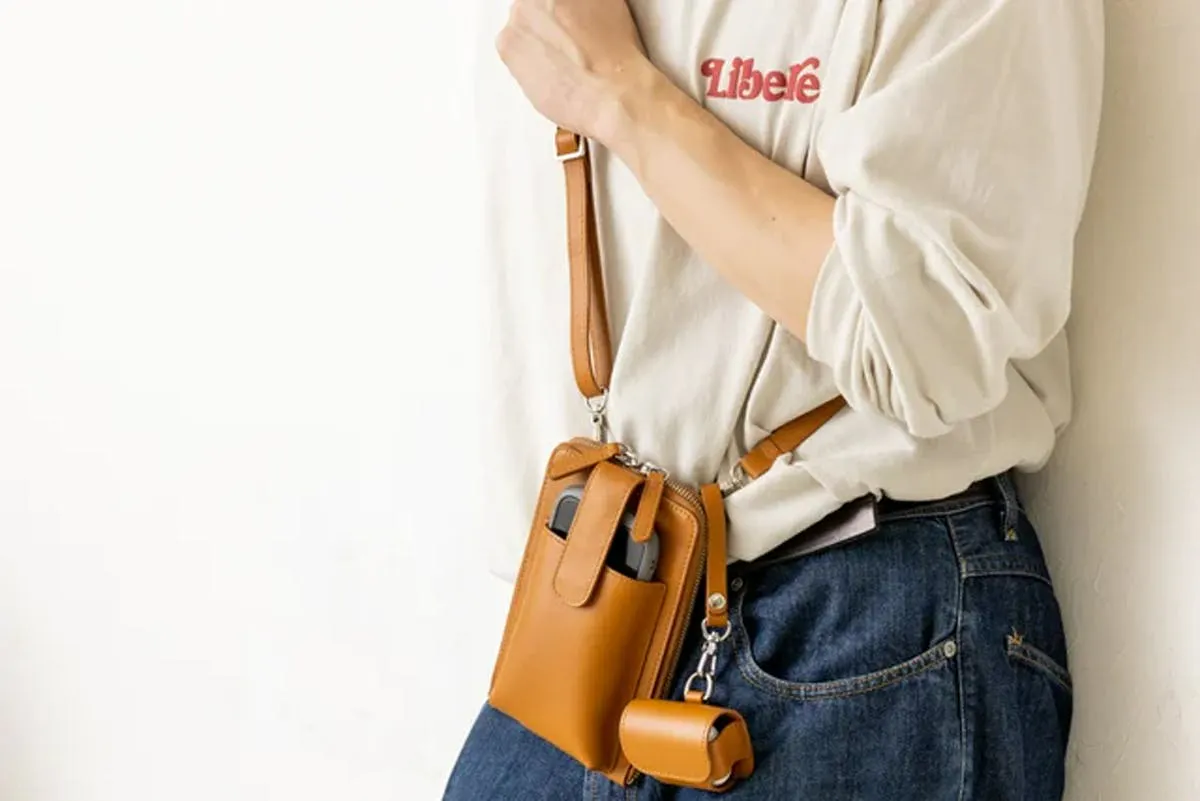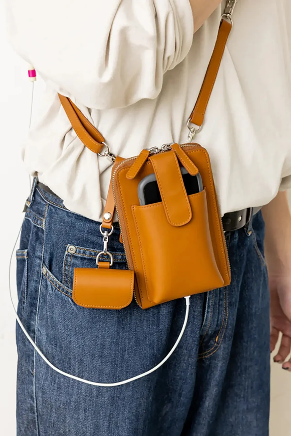 ポーチを掛けたままモバイルバッテリーで充電したり、イヤホンを挿して移動中にも音楽など楽しめます。