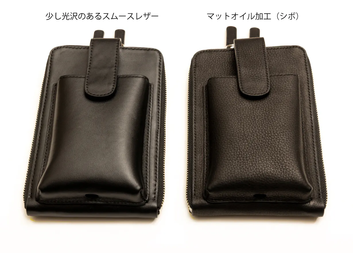 他カラーと同じ少し光沢のあるスムースレザーとマットオイル加工でしっとりとした手触りのシボレザー(シワ)です。