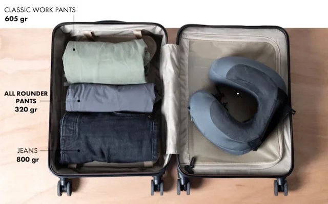 一般的なワークパンツやジーンズと比較すると、収納時のスペースに不思議な程に違いがあるのが分かります。