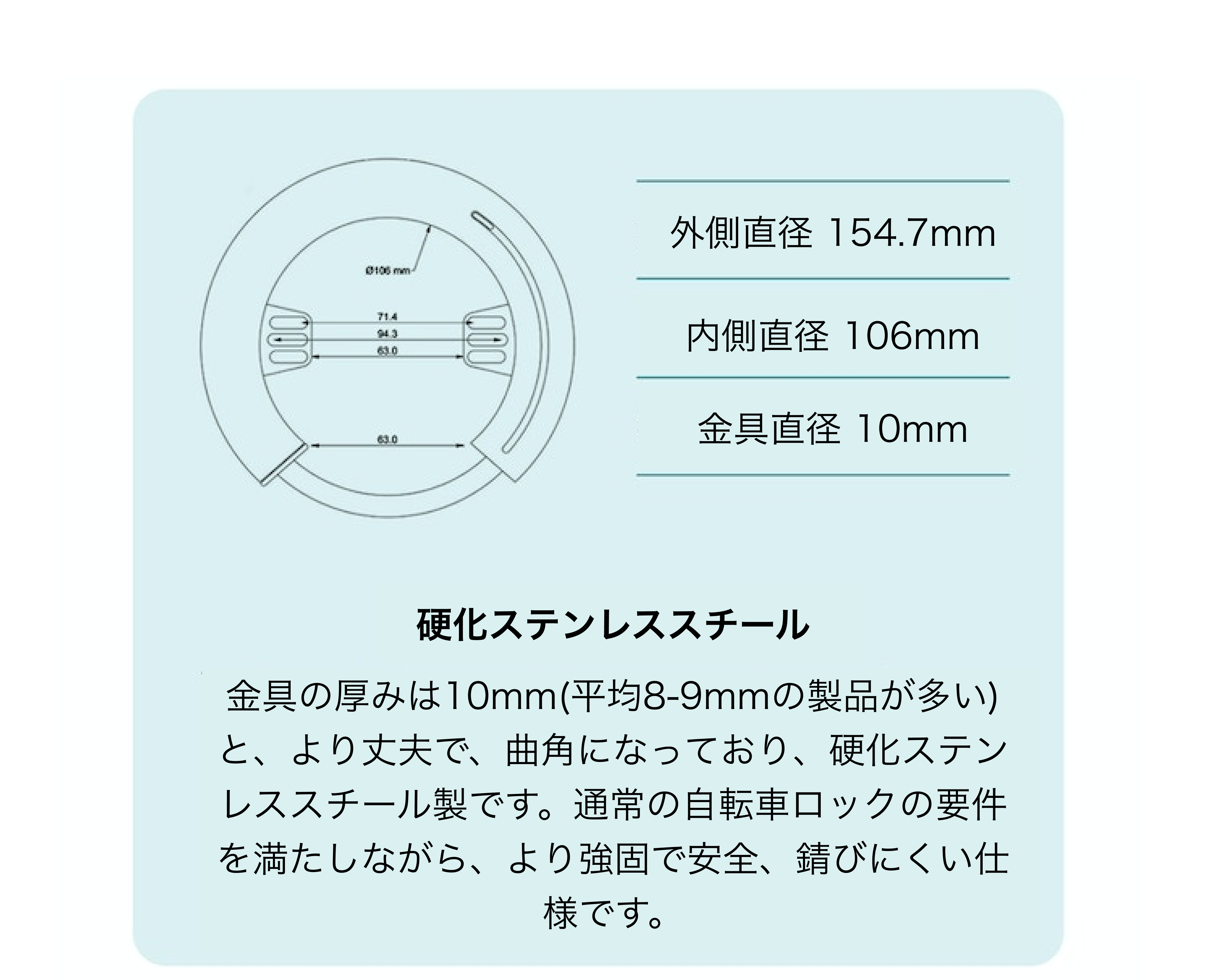 A: シャックル(10mm;平均は8-9mm)とパイプ(直径25mm、材料厚さ2mm)は、一般的な自転車用ロックの基準を満たす硬化ステンレススチールで作られています。これにより、頑丈で安全でありながら、錆びにくいのが特徴です。