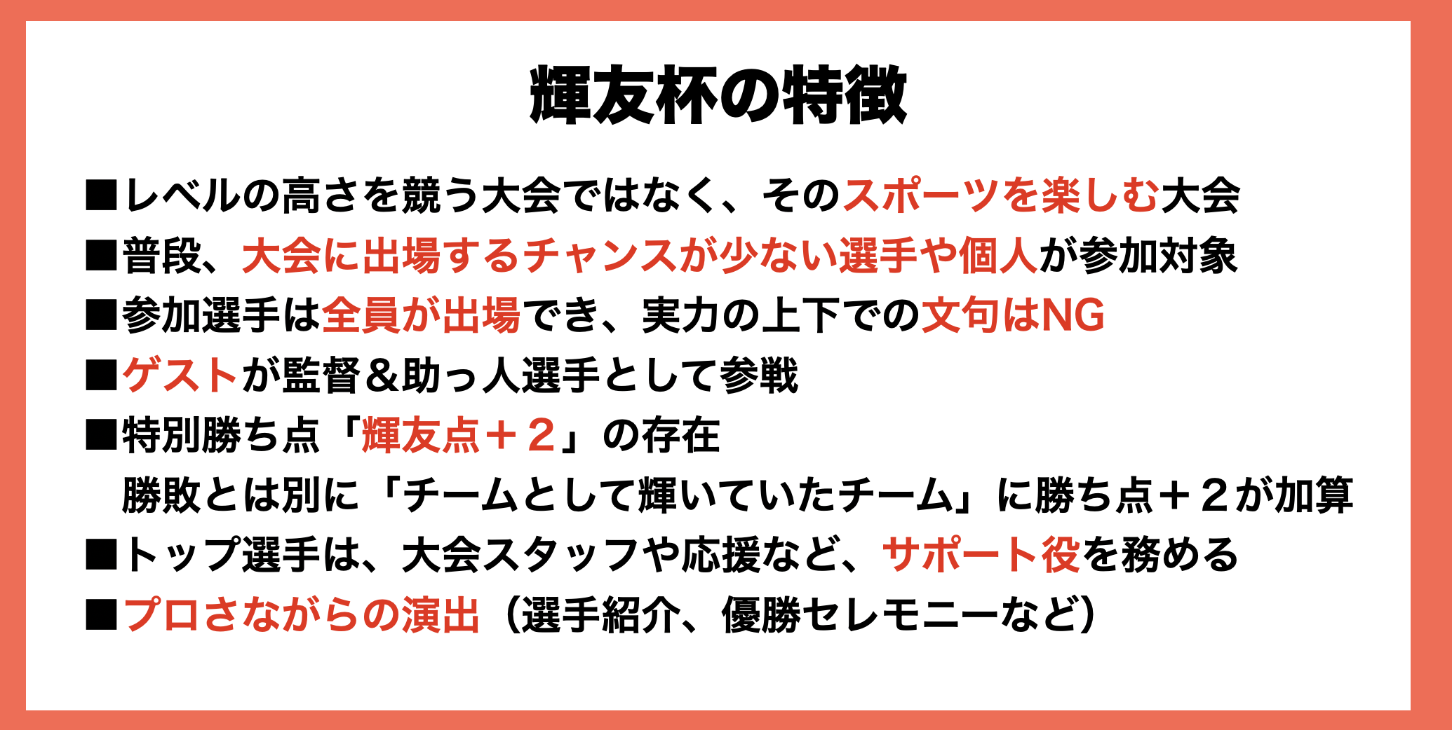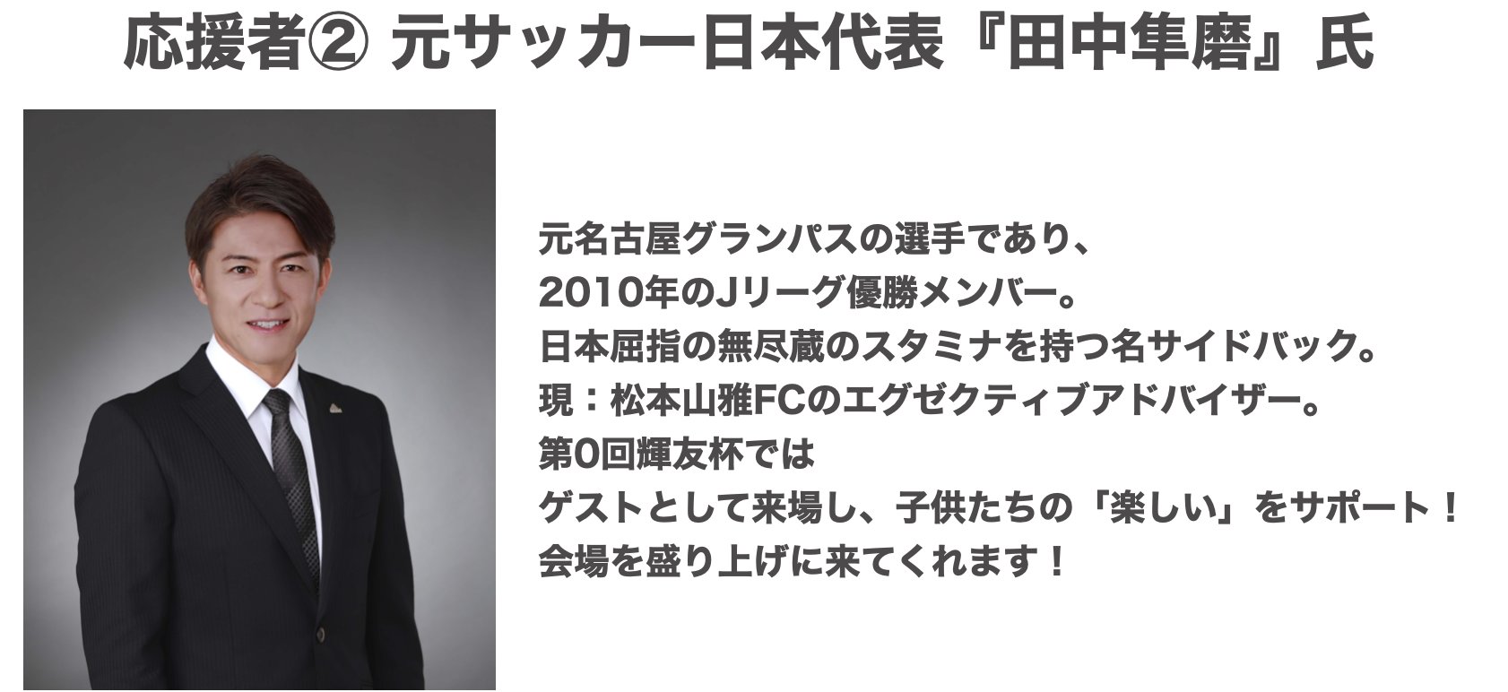 第0回輝友杯にゲストとして参加できることをとても楽しみにしてます。子供達には是非楽しんでもらいたいし、スポーツの素晴らしさを伝えていきたいと思っています。当日、皆さんにお会いできることを楽しみにしています。よろしくお願いします。