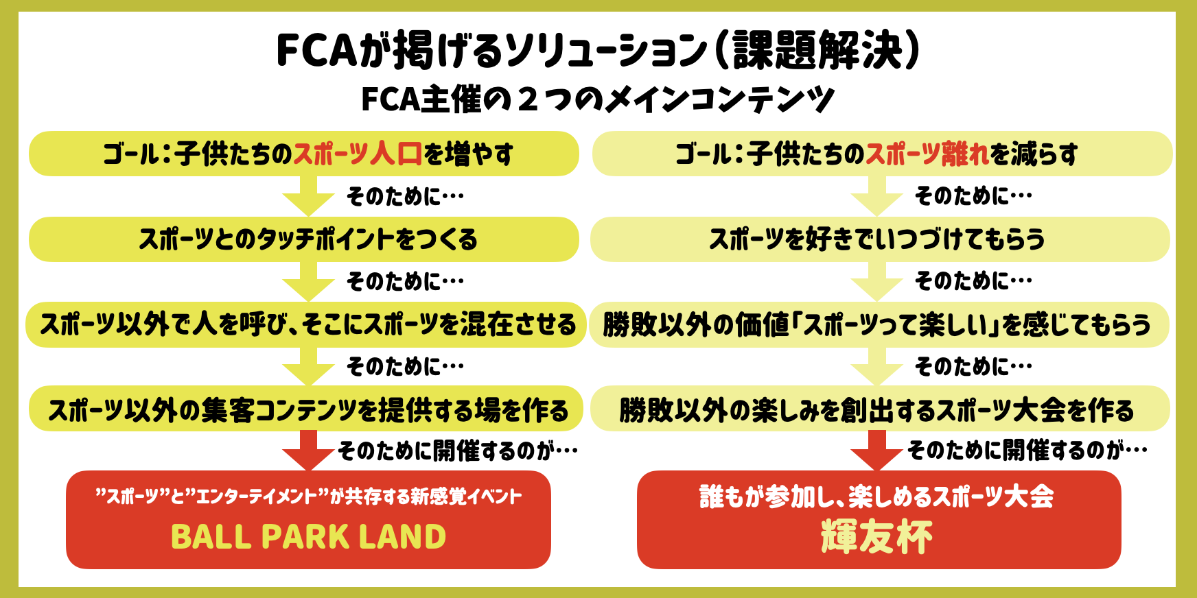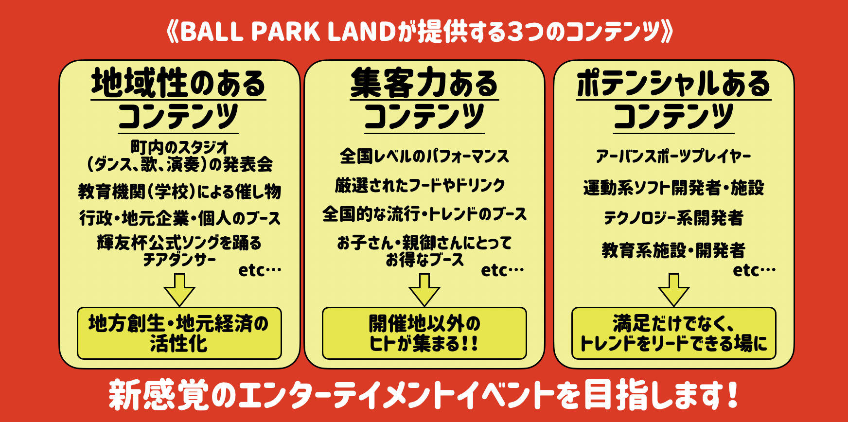 そんな課題を解決する存在が「ボールパーク」であり、そんなボールパーク普及に貢献する第一歩として、「イベント型ボールパーク」の「BALL PARK LAND」を開催することを決めました。「BALL PARK LAND」が最も重要にしているのが「FUN=楽しいを届けること」とスポーツの「FAN=ファンを増やすこと」。