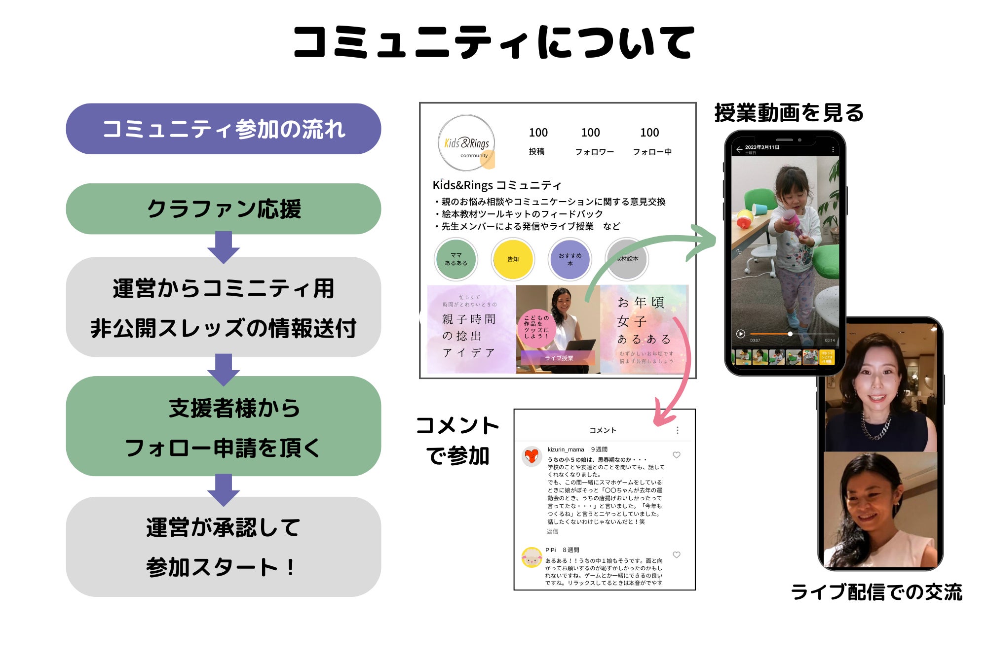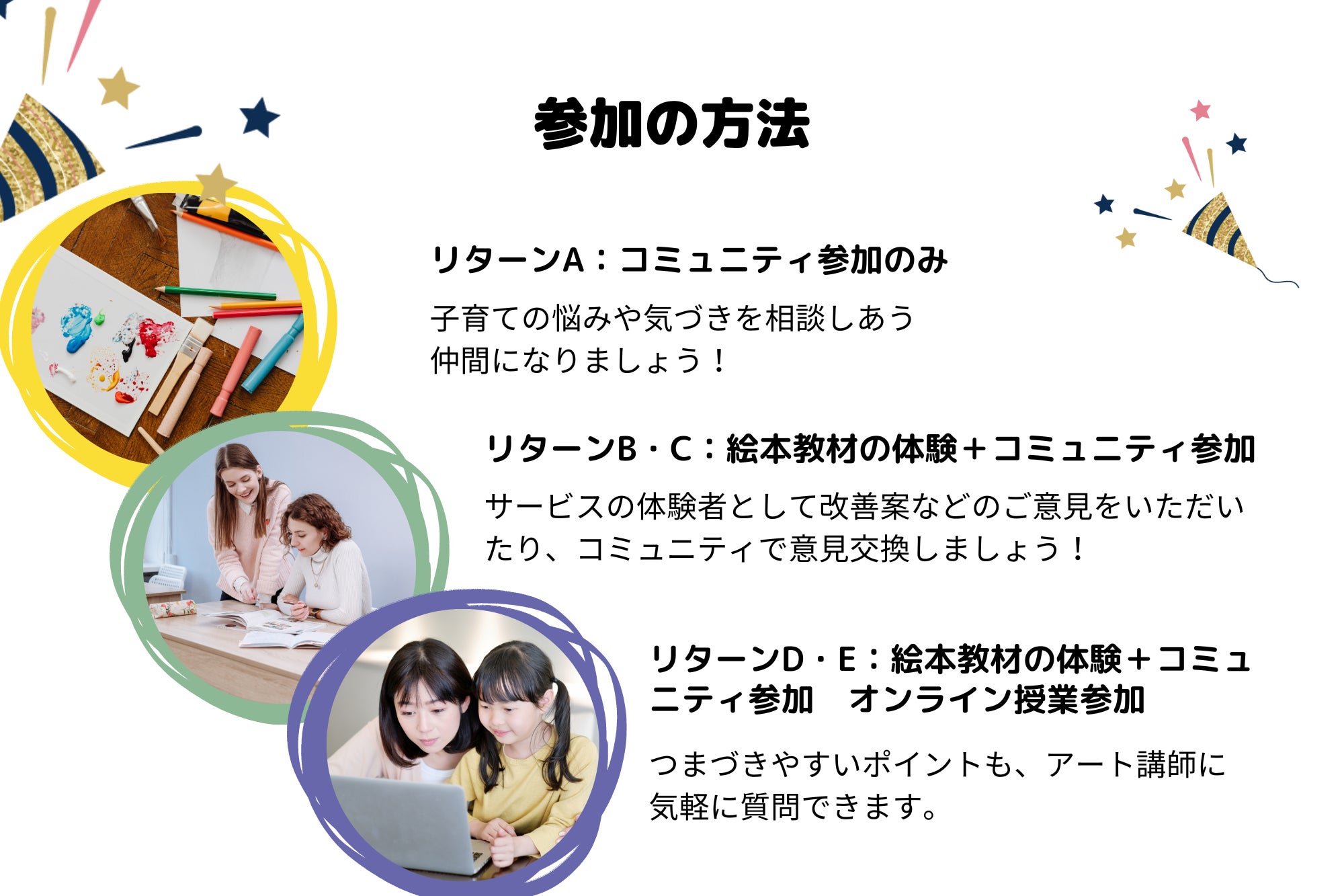 ①絵本教材 ②オンライン授業 ③コミュニティを提供し、