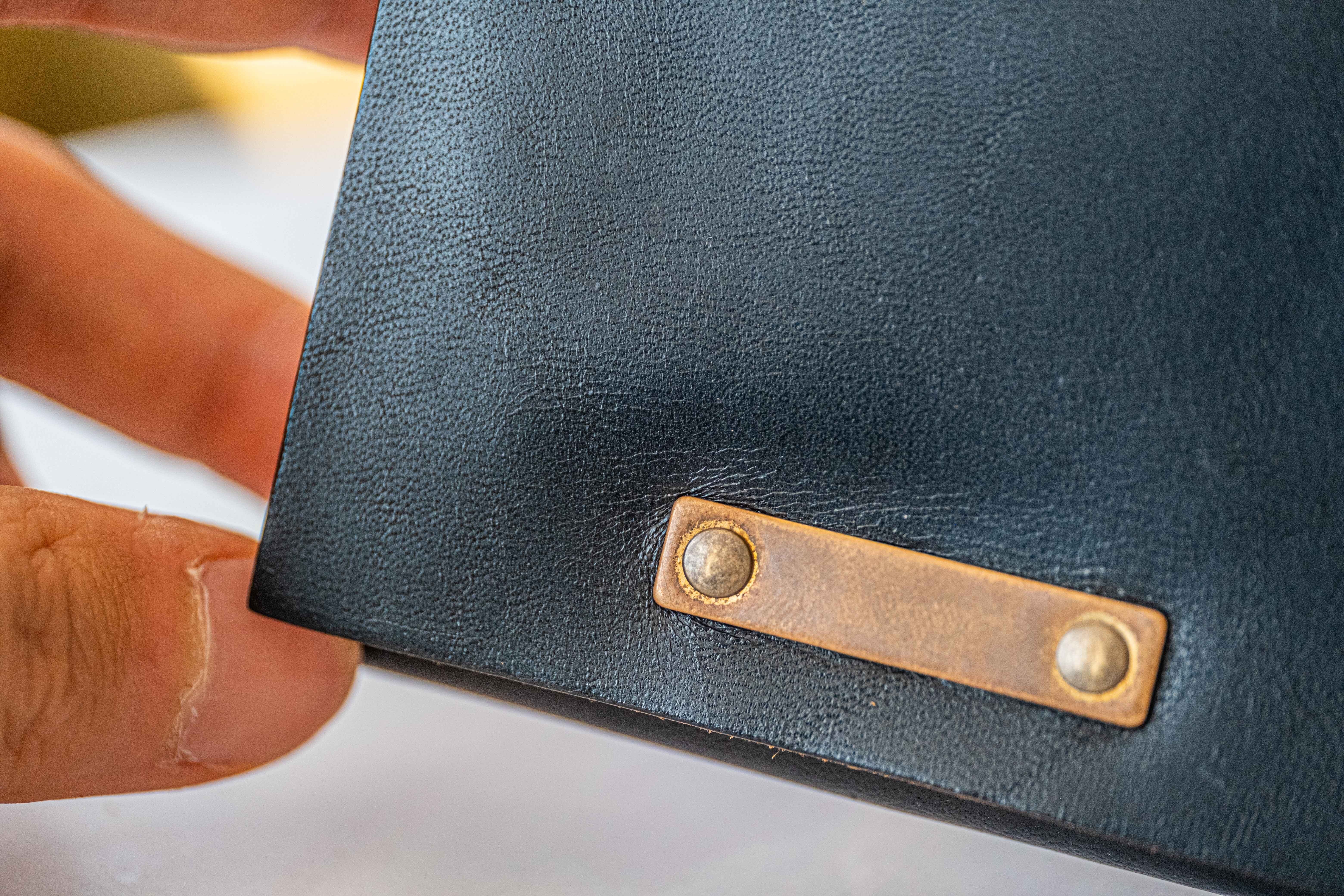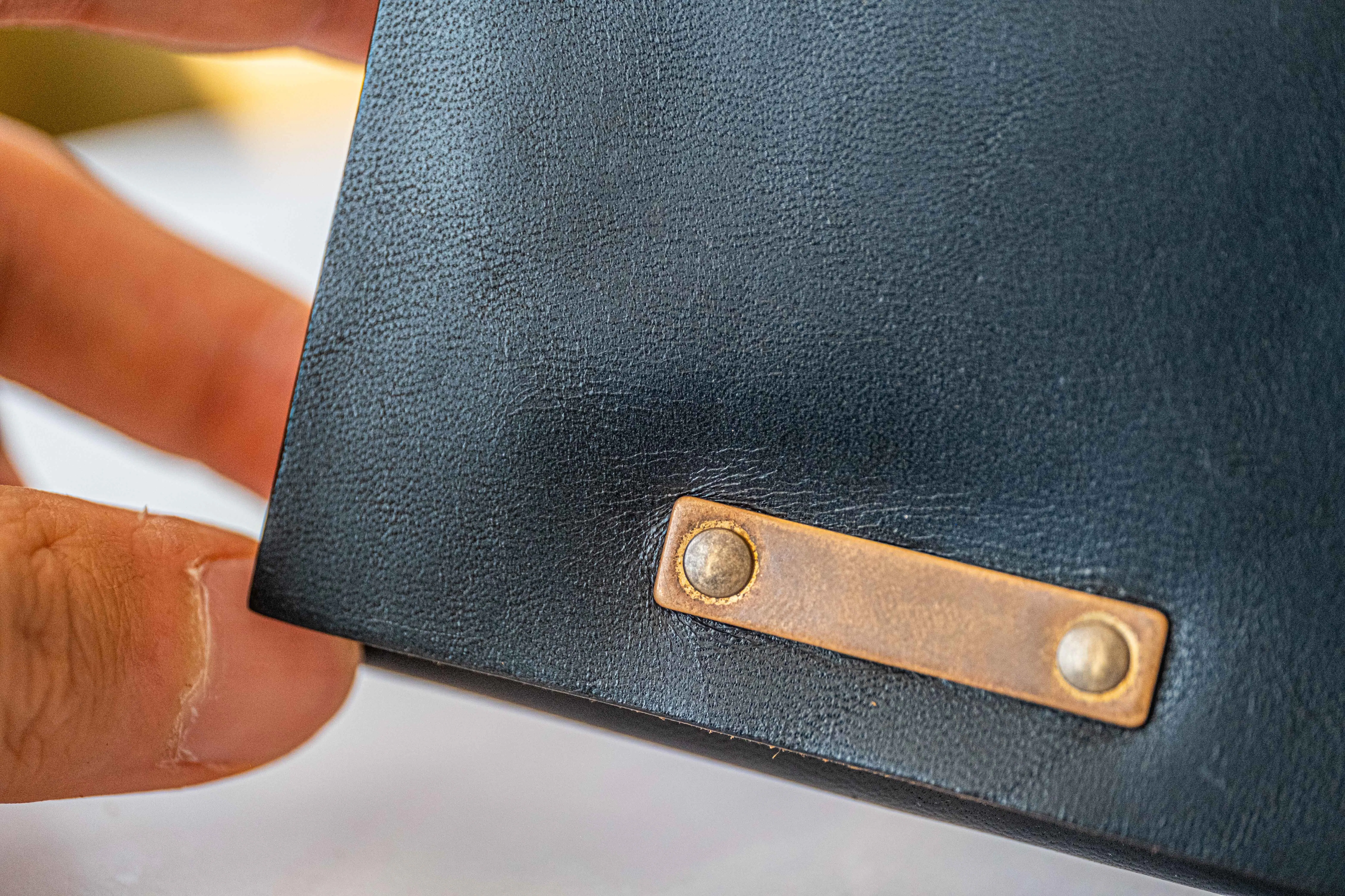 こちらは、繊維密度が高い馬の臀部(尻部分)の皮を植物タンニンでなめし、茶系の色で下地染色をした後、表面を黒の顔料で塗装した茶芯レザーとなります。