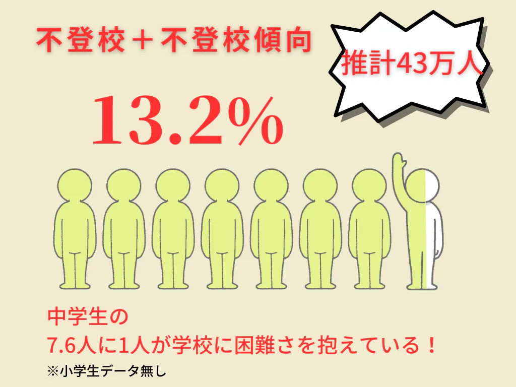 文科省の調べによると、不登校傾向にある中学生(小学生データ無し)と合わせると43万人もの生徒が学校に対し困難さを抱えているのです。