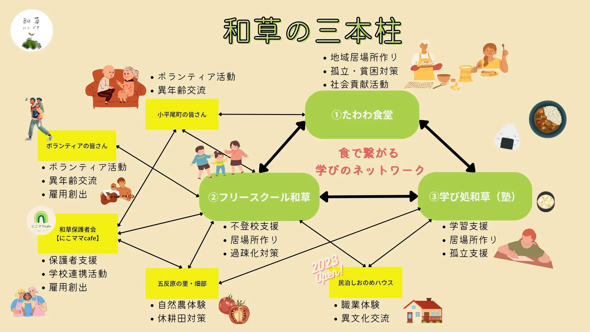 2024/02/26 16:37いつも応援ありがとうございます!クラウドファンディング終了後にも子どもの明るい未来の為に様々な活動に取り組んでいます!最近の一般社団法人和草の活動をいくつかご紹介します☆●にこママカフェフリースクール和草・親の会「にこママカフェ」では、毎月第二金曜にお茶会をしています。不登校に悩む親御さんをはじめ、子育て世代の悩みを何でも共有できる場として広く活動しています。そして今回初めて、和草&にこママカフェ主催で、ゲストを招いての特別イベントを開催することになりました。子どもを信じるってどういうこと?~学校に行かない選択をした親子のお話~+2023年度フリースクール和草活動報告会クラウドファンディング終了後、初の大型イベント開催にワクワクしています!子ども達を取り巻く環境の目まぐるしい変化に、私たち大人がついていく為には、今までの価値観をひっくり返すくらいの出会いが必須!!と日々感じている私たちが選んだ講師は「不登校になって伸びた7つの能力」の著者でもある、 吉田晃子(よっぴー)さん、星山海琳(まりん)さん親子です。決して誰も何も否定せず、そのままありのままを肯定しつつ、新しい価値観で世界を捉えて自分も楽に生きる知恵がたくさん詰まった講演会になると思います!アーーンド、クラファンのまとめも兼ねての2023年フリースクール和草活動報告会も同時開催です!こちらもキラキラが溢れる子ども達の様子を見て頂ける内容です。今週末の開催ですので、是非お越しくださいね!お申し込みはコチラ●大人フリースクール「道草農園」五反原の里で自然農を通じて多様な人が集える居場所作りをしています。毎月 第二月曜日 10時~毎月 第四日曜日 10時~どちらも大人一人500円で自由に参加できます!参加希望の方は和草ホームページかInstagramからご連絡下さいね!和草ホームページ道草農園Instagram●高校生民泊「しおのめハウス」生駒駅の駅前に遂にオープンした「しおのめハウス」ぞくぞくとご予約を頂いております!宿泊以外にもスペースを利用したイベントも開催しております。是非お気軽に遊びに来てくださいね。詳細はコチラ↓しおのめハウス もっと見る