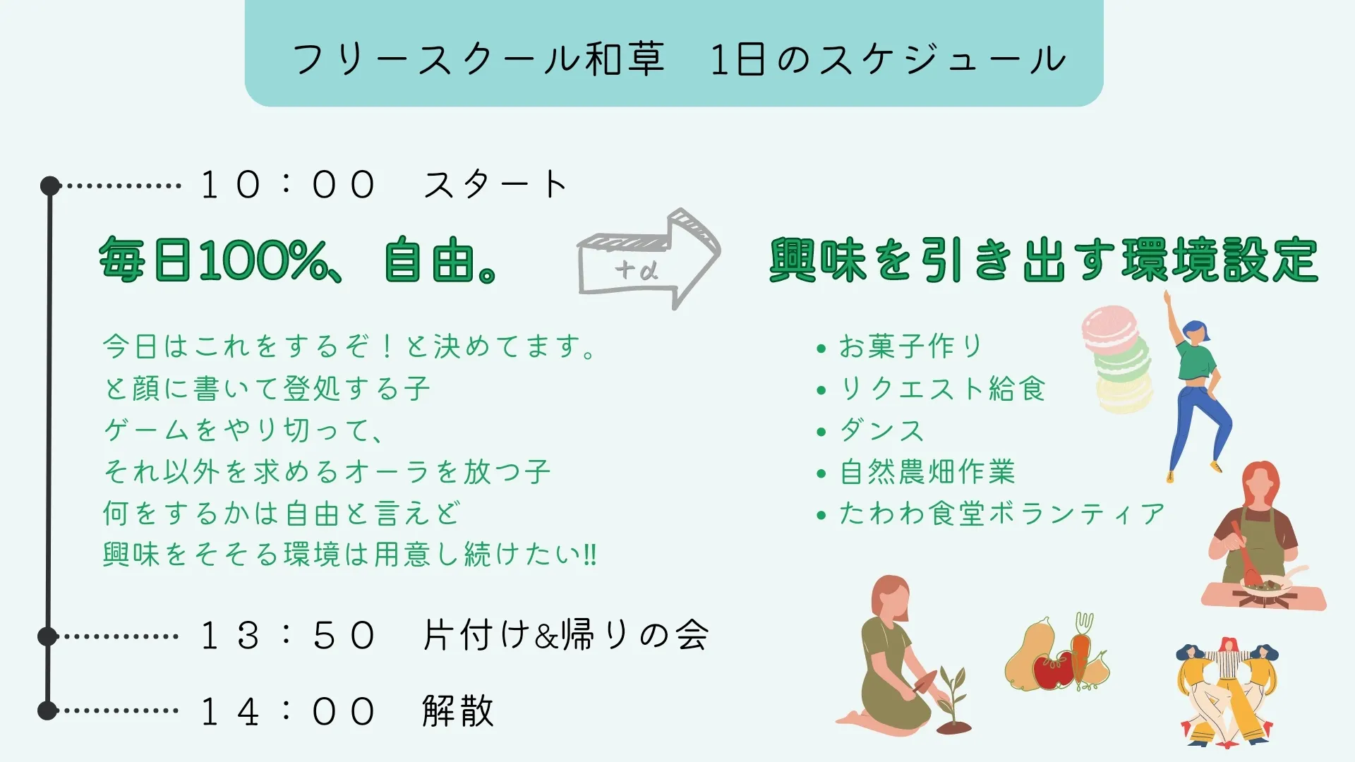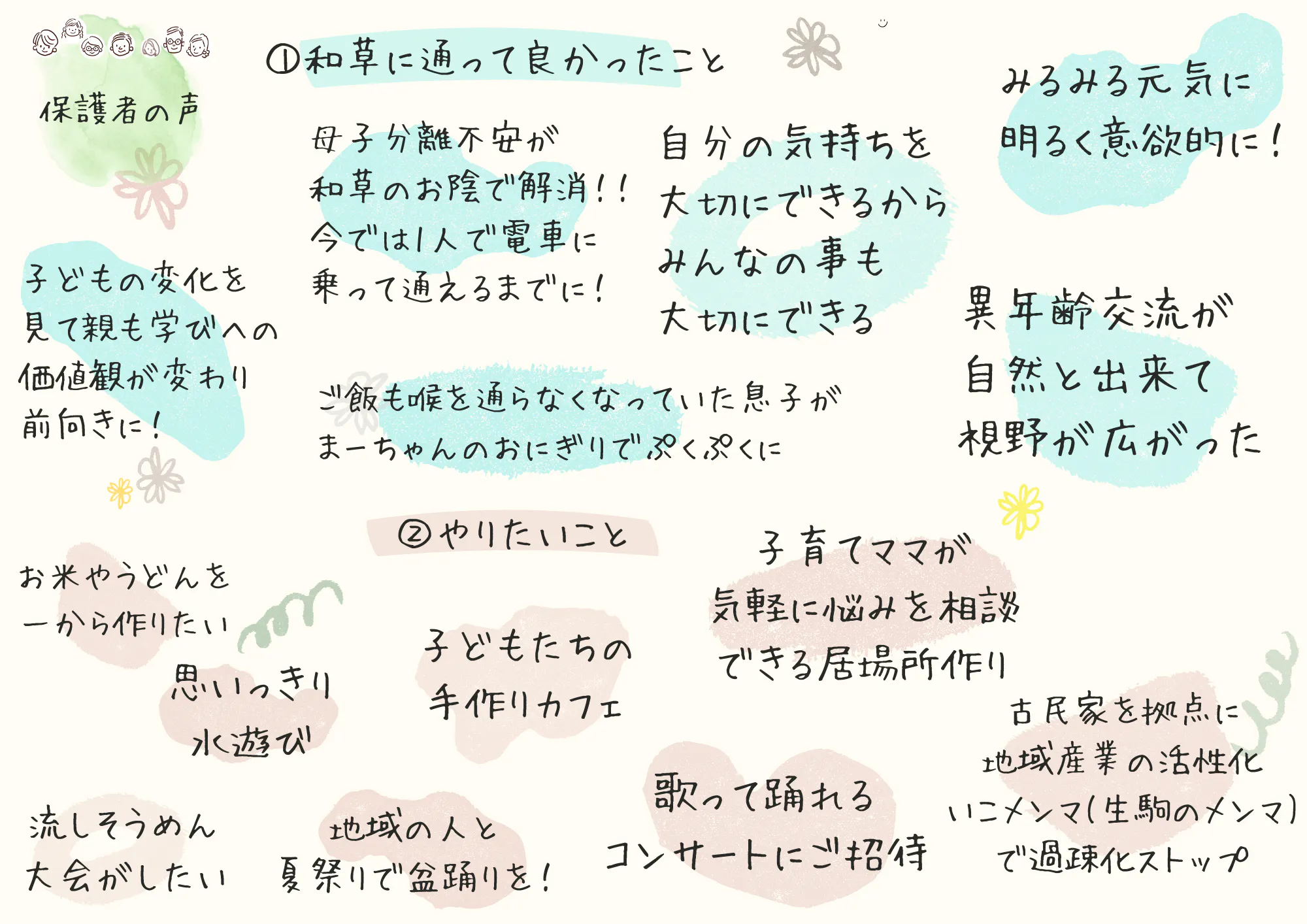 カリキュラムのない和草で私たち大人が出来ることは将来自分のルーツとなる経験を、地域の人と共に重ねる環境を整える事です。子どもたちのより深い学びと地域活性化を皆様と一緒に実現させたい。