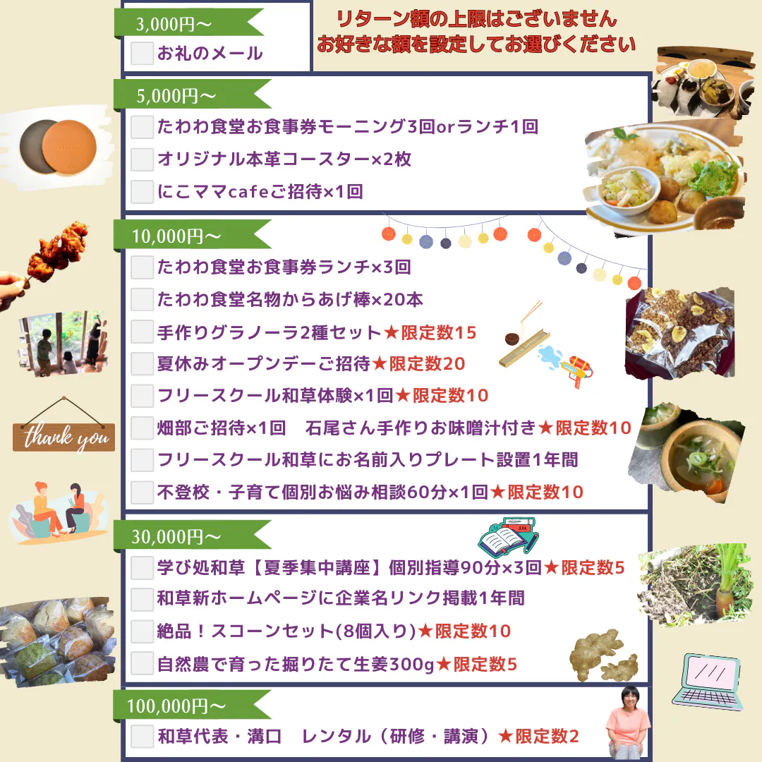 2024/02/26 13:02いつも応援下さりありがとうございます!最終リターンチェックにより一部漏れのあったリターンも発送を完了し、本日を持ちましてすべてのリターンが終了しましたことをご報告致します。なお、工事も昨年全てを完了し、NEW和草で子ども達は毎日快適にご機嫌に活動しております!水もトイレもキッチンもクーラーも皆様のご支援なくしては実現しなかった環境整備。日々有難さを感じております。たくさんの方にご支援頂きましたこと改めて厚く、熱く、御礼申し上げます。これからも和草はスタッフ・保護者一丸となって子ども達の未来の為の活動を続けて参ります。是非とも引き続き応援を宜しくお願い致します。※リターンの履行は全て完了しておりますが、たわわ食堂の各種チケットをお選び頂きご支援くださった方の中には、まだご来店がない方も多くいらっしゃいます。3月末まで有効ですので、お心当たりのある方は是非ご来店お待ちしております!フリースクール和草 担当:さわ もっと見る
