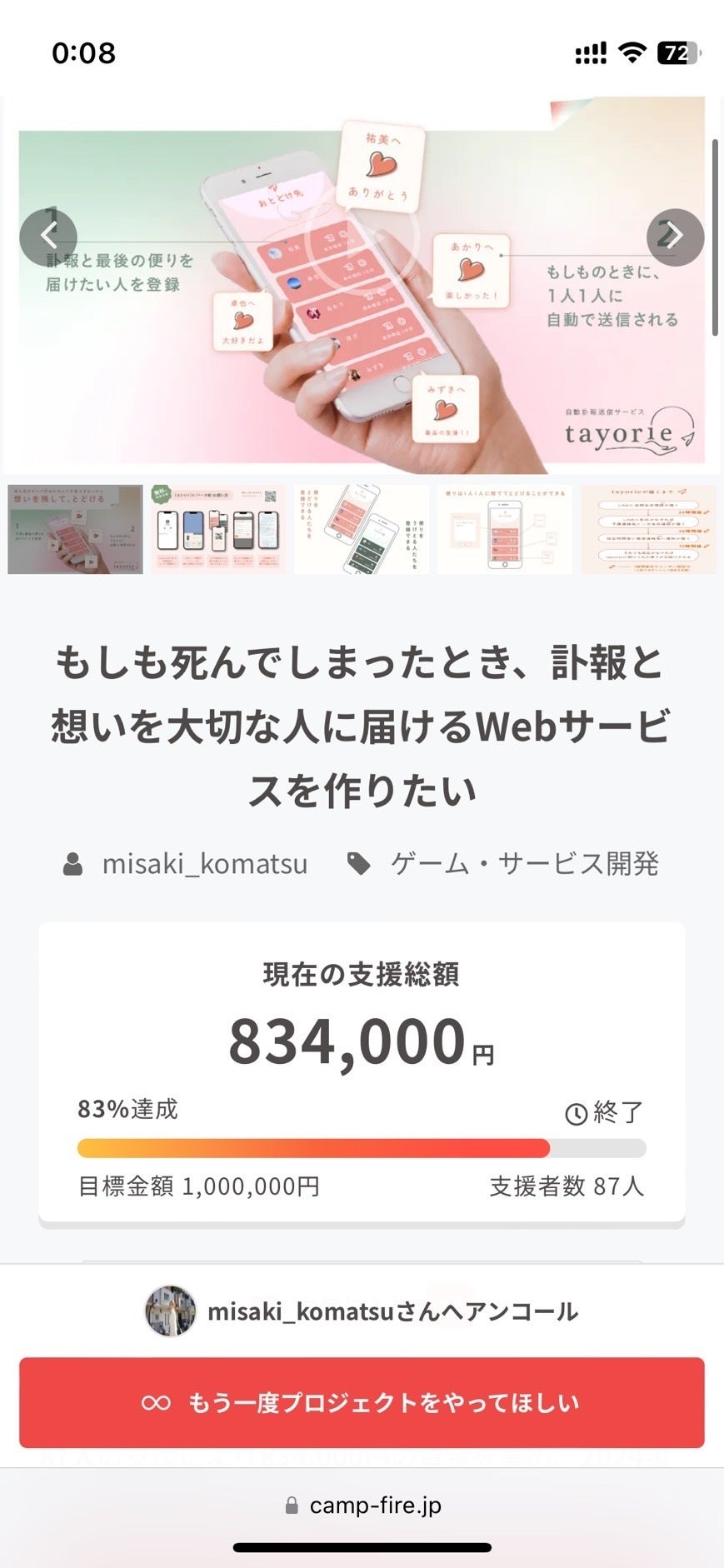 2024/05/16 21:00お世話になっております。 株式会社tayoriの小松です!現在、tayorie〝たよりえ〟という、自分が死んでしまった時に訃報と最後の便りを自動で送信できるサービスの正式版を制作するため、クラファンに挑戦中です。公開して11日が経過し、現在の総支援額は400,000円、53名の方にご支援いただいております。皆様の応援が本当にうれしいです・・・!応援コメントや、支援時の備考欄のメッセージ、すべて大切に読ませていただいております。励みとなったり、アイデアのインスピレーションが湧いたり。すでにたくさんの応援をいただいていて大変恐縮なのですが・・・公開終了まで残りちょうど1か月となりました。改めて、ご自身のSNSや口コミでのシェアをどうかお願いできればと思います。1人でも多くの人に届けるお力添えをなにとぞ、お願いいたします・・・!!!▼シェア用URLhttps://camp-fire.jp/projects/view/660771?utm_campaign=cp_po_share_c_msg_mypage_projects_show最近、「人生の終い方」(講談社)という本を読みました。(以下「講談社BOOK倶楽部 内容紹介」より抜粋)______________________________ 自分の人生がもう長くないとわかったとき、あなたなら何をしますか。誰に何をのこしますか。あるいはのこさないですか。私と一緒に考えてみませんか。落語家の桂歌丸さんが高座の上からこう呼びかけて始まったNHKスペシャル「人生の終(しま)い方」。20代から高齢世代まで、幅広い年代層に大きな反響を呼んだ同番組が書籍化されました。当事者を通して人生の終い方に迫るという、かつてない番組に「新しい生き方を見いだした」「今を大事にしていきたい」などという声がたくさん届いています。______________________________そこには、人生を終うときの1人1人の想いが鮮明に、強く、記されていました。本文の内容にひどく心を打たれ考えさせられたのは言わずもがなですが、私は前書きの一節が1番強く印象に残っております。「大切な人の心の中で生きていく準備あなたはできていますか?」ずっと、tayorieを作るうえで「tayorieは常に〝死〟と向き合うサービスで、その言葉は重く暗い印象を与えてしまうかもしれません。しかし、tayorieは〝死〟そのものではなく、〝残された人の未来〟に寄り添うサービスで在るよう努めます。」という信念を、私の中で大切にしています。それを、まさしく一言で表してくれているのが上の一節だなぁ、と。「死ぬ準備」ではなく、「大切な人の心の中で生きていく準備 」言葉遊びと思われるかもしれませんが、この想いをブラさず、サービスの届け方と真摯に向き合っていこうと思います。引き続き、何卒応援のほどよろしくお願いします!!! もっと見る